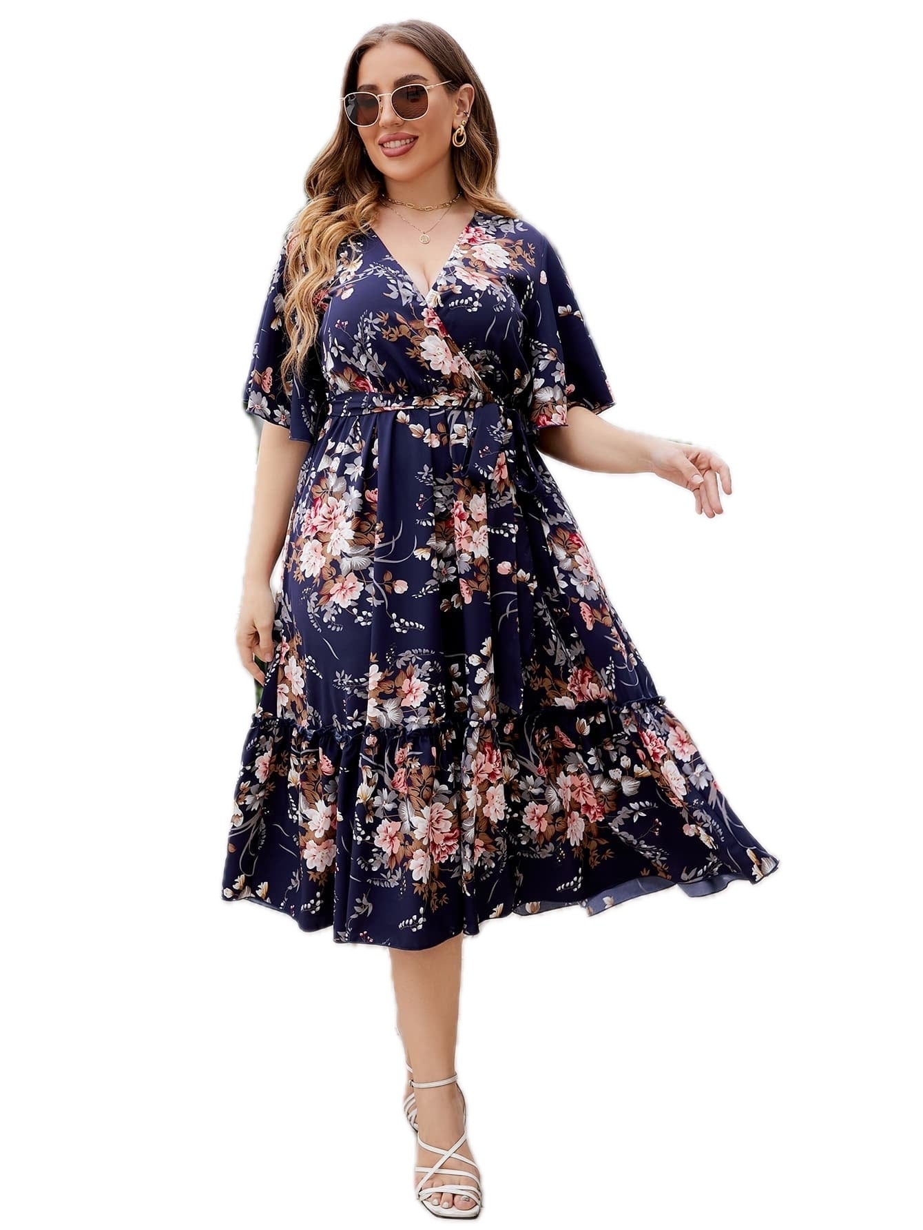 Women's Plus Size Floral Surplice Neck Midi Dress with Flutter Sleeves and A Line Hem for Elegant Everyday Wear