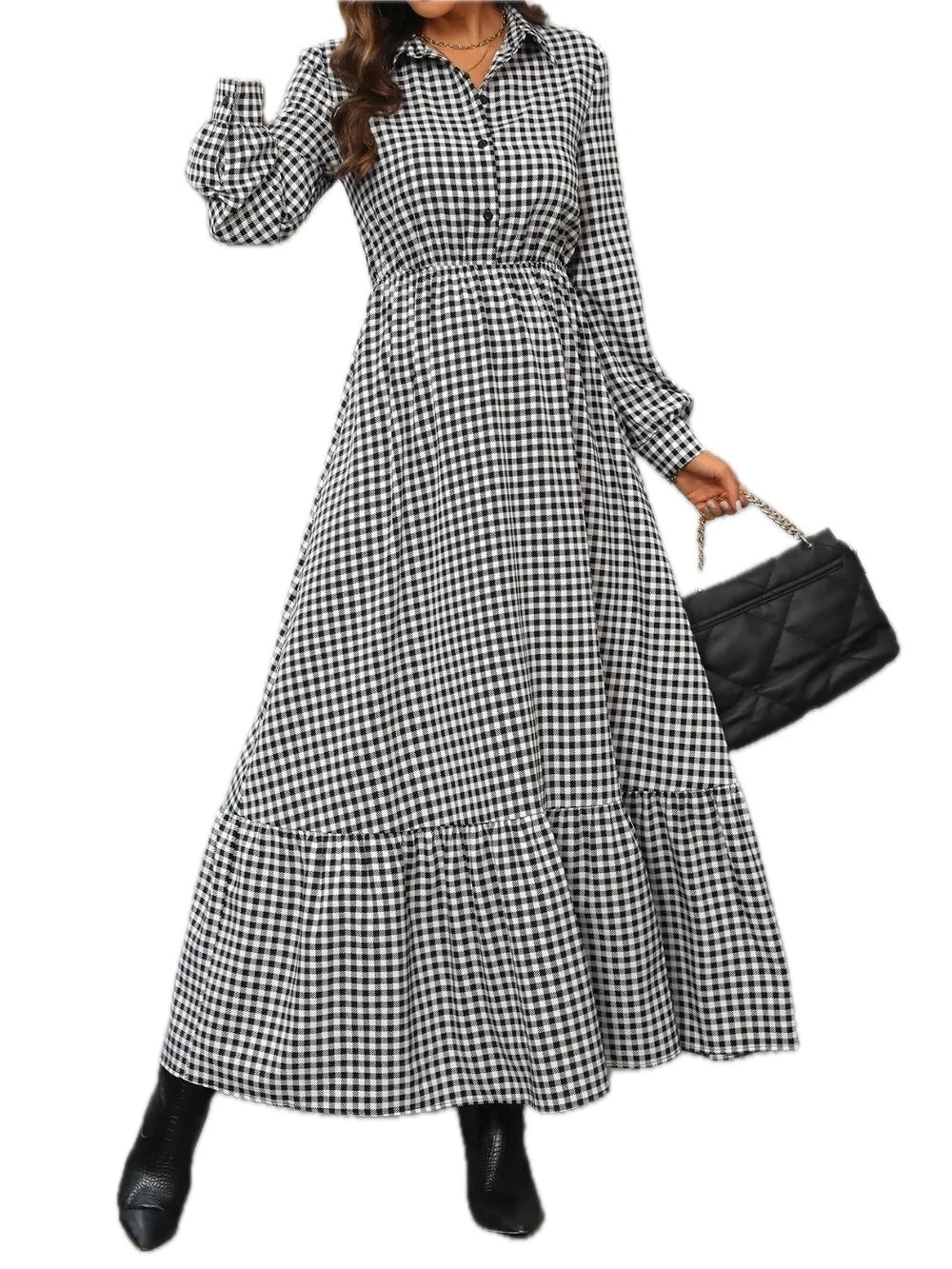Women's Honey Ruffle Hem Plaid Long Sleeve Dress 100% Polyester Lightweight Comfortable Everyday Wear For All Seasons