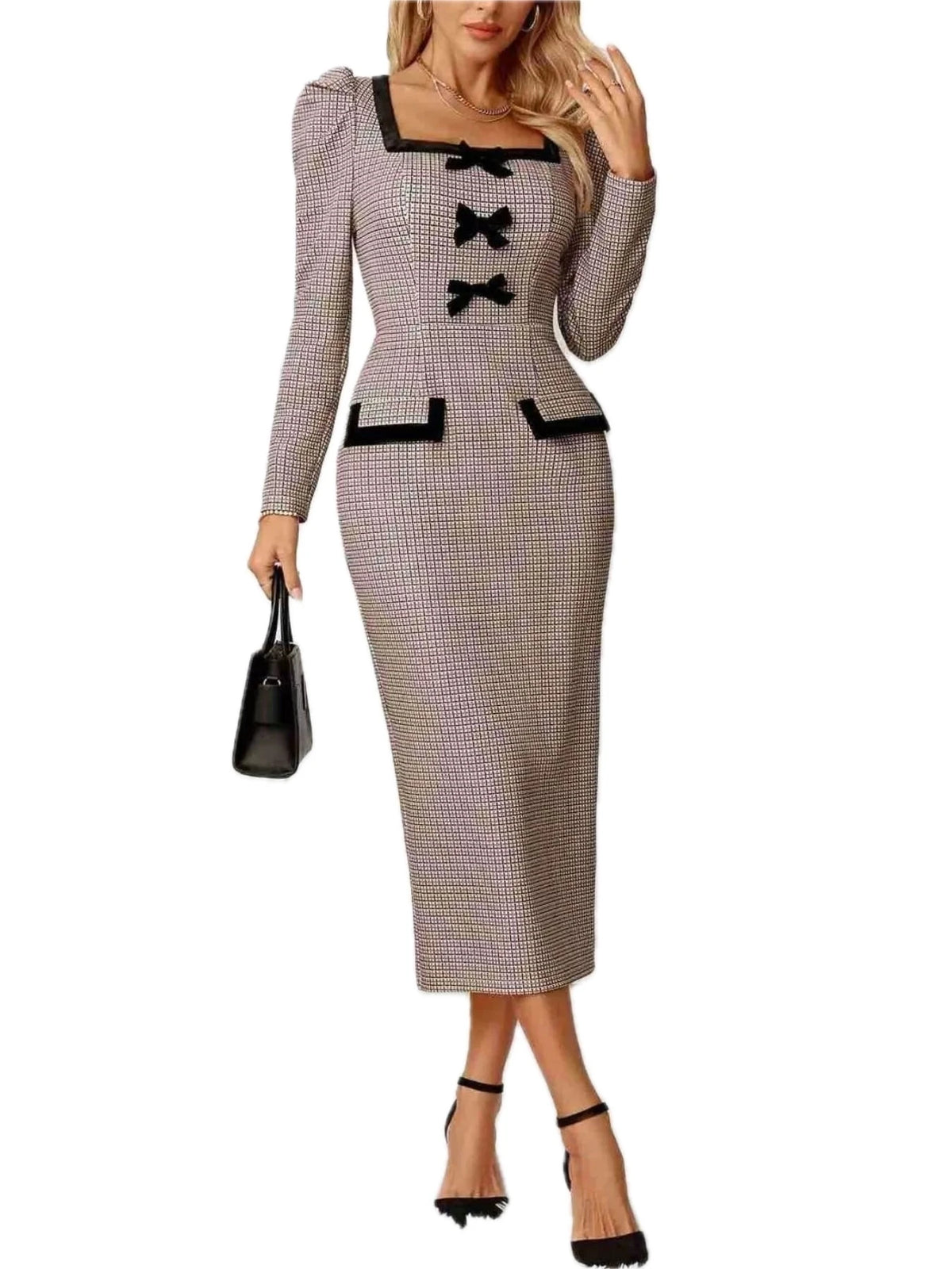 This sophisticated midi dress features a classic houndstooth pattern in neutral tones with elegant black bow accents on the front. The square neckline adds a modern touch while the fitted silhouette creates a flattering hourglass shape. Made from high-quality stretch fabric that provides comfort and durability. The long sleeves and midi length make it perfect for professional settings, business meetings, or formal occasions. Black contrast trim along the neckline and pockets adds visual interest and definition. This versatile piece transitions seamlessly from day to night, making it an essential addition to any wardrobe for the fashion-forward woman who values both style and sophistication.