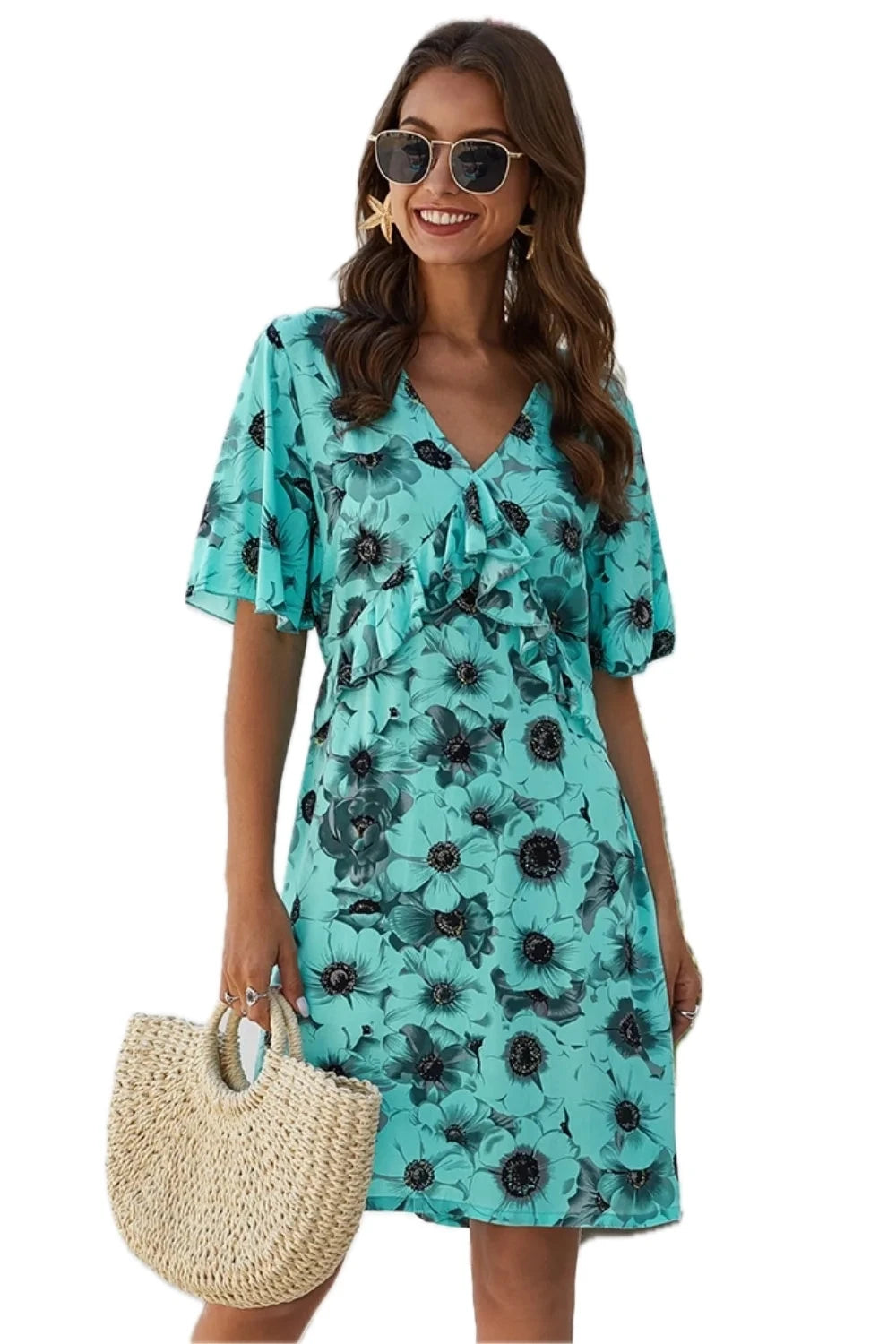 Women's Backless Ruffled Printed V Neck Dress with Sheer Overlay 100% Polyester Fabric Ideal for Evening Events