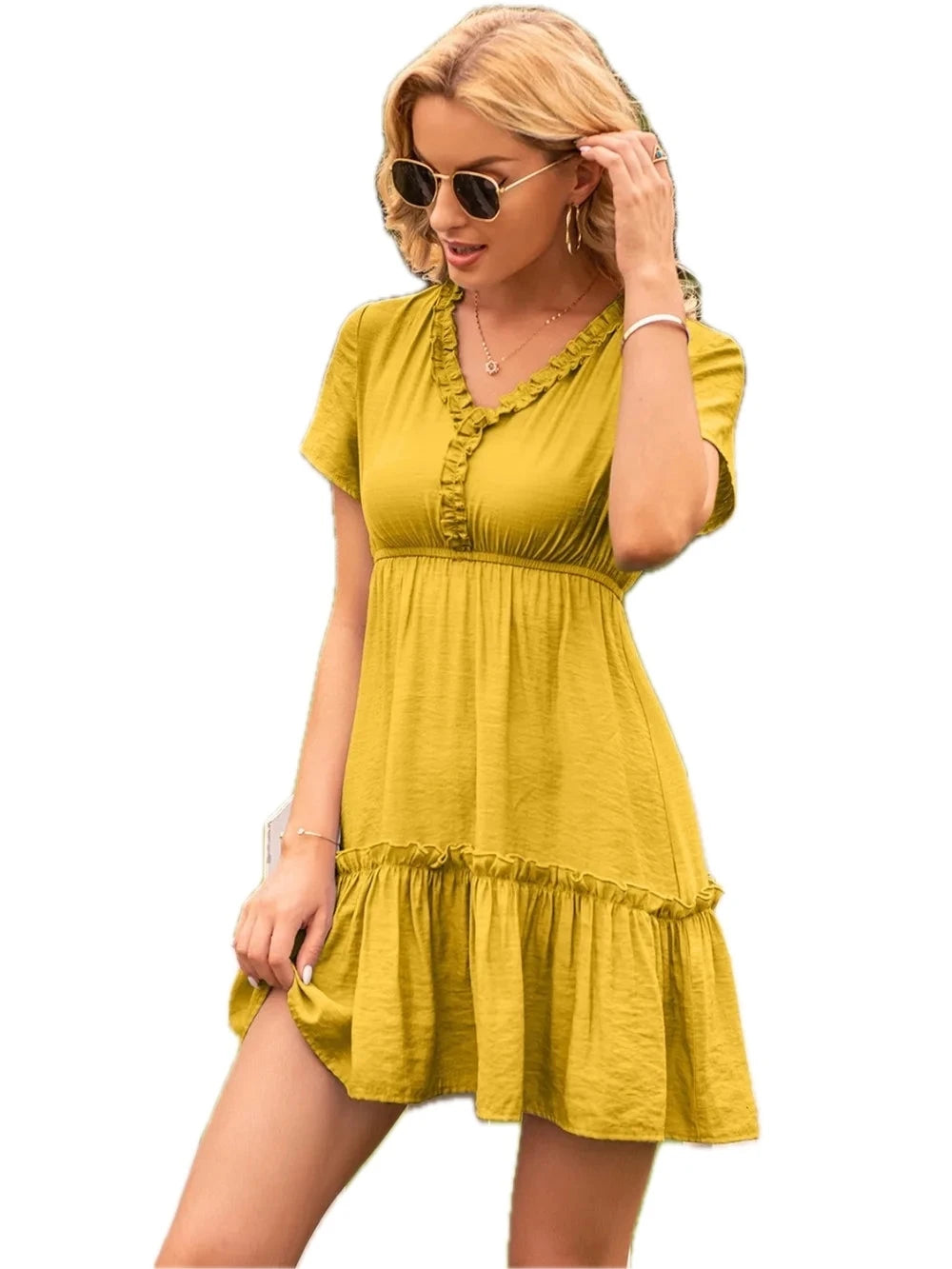 Women's Frill V Neck Short Sleeve Dress with Ruffle Hem 100% Polyester Lightweight Silhouette for Daytime Outings