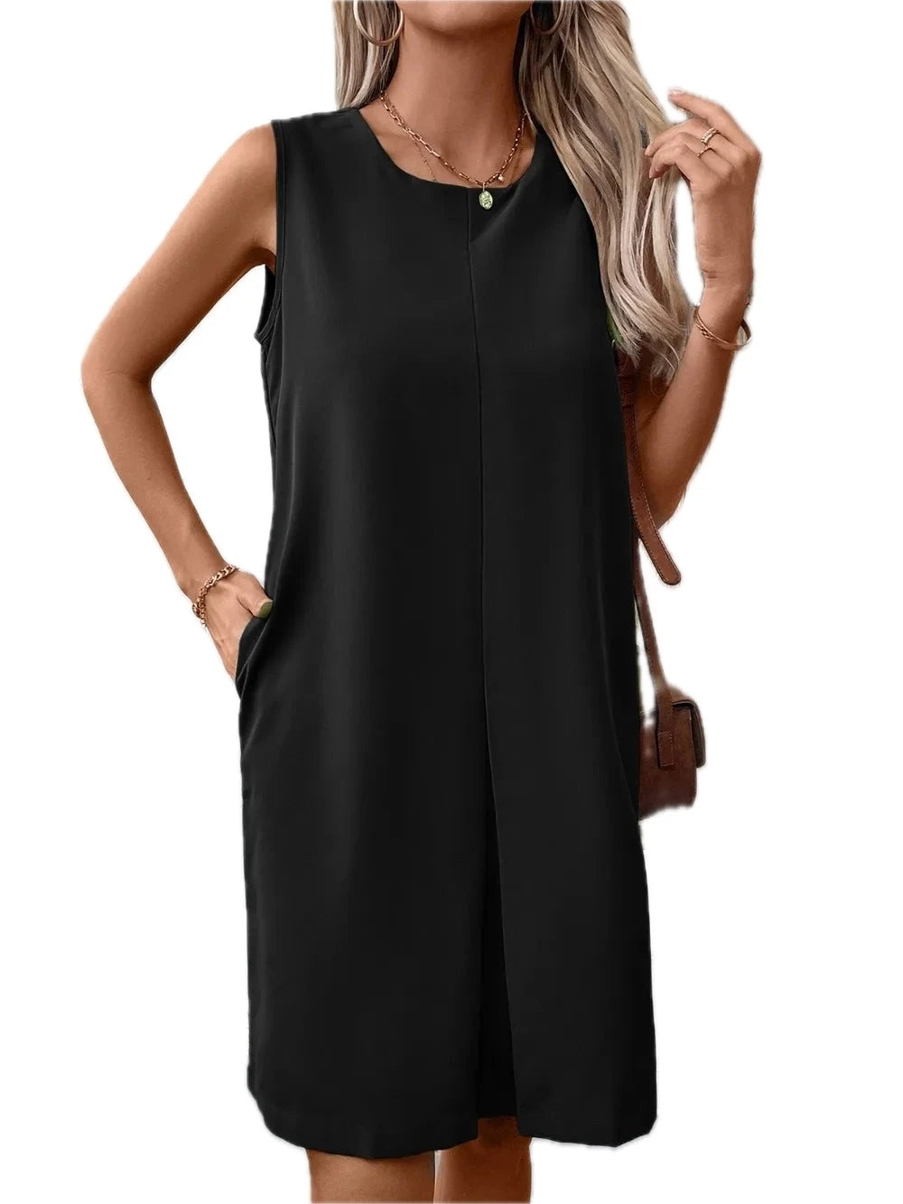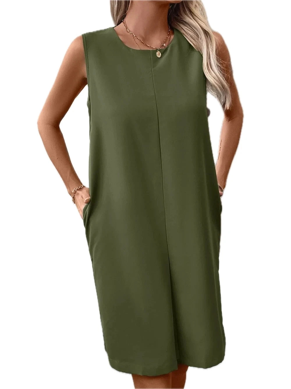 Women's Pocketed Round Neck Sleeveless Mini Dress in 100% Polyester Everyday Comfort and Easy Style Ideal for Daytime