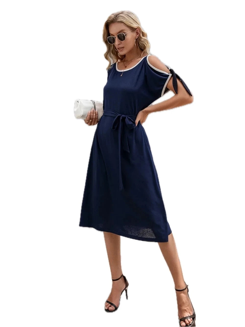 Women's Round Neck Cold Shoulder Dress 100% Polyester Tied Sheer Detail Not Lined Elegant Evening Wear Party Ready