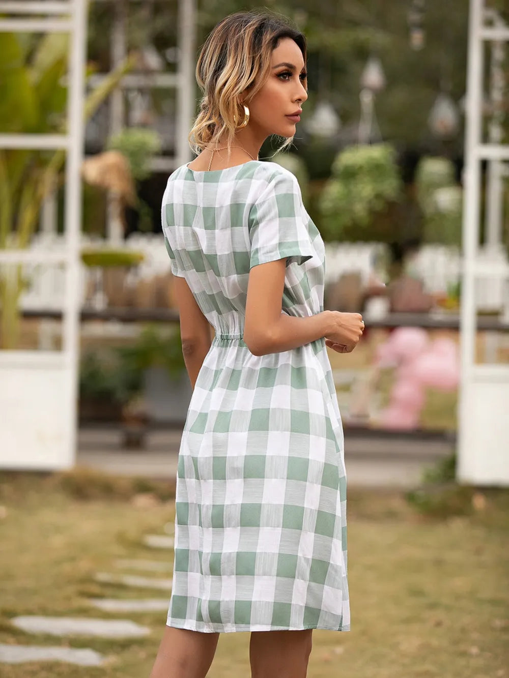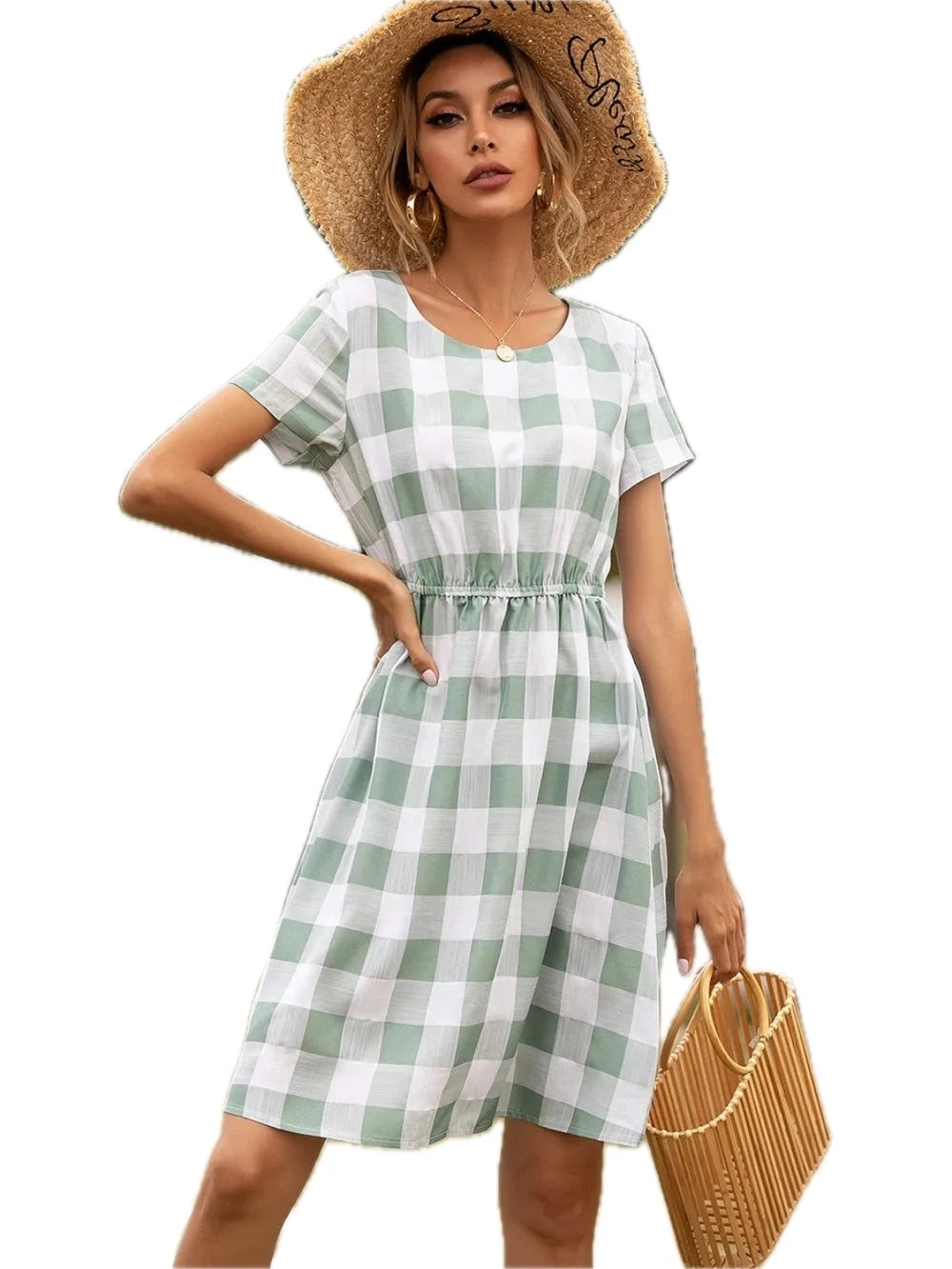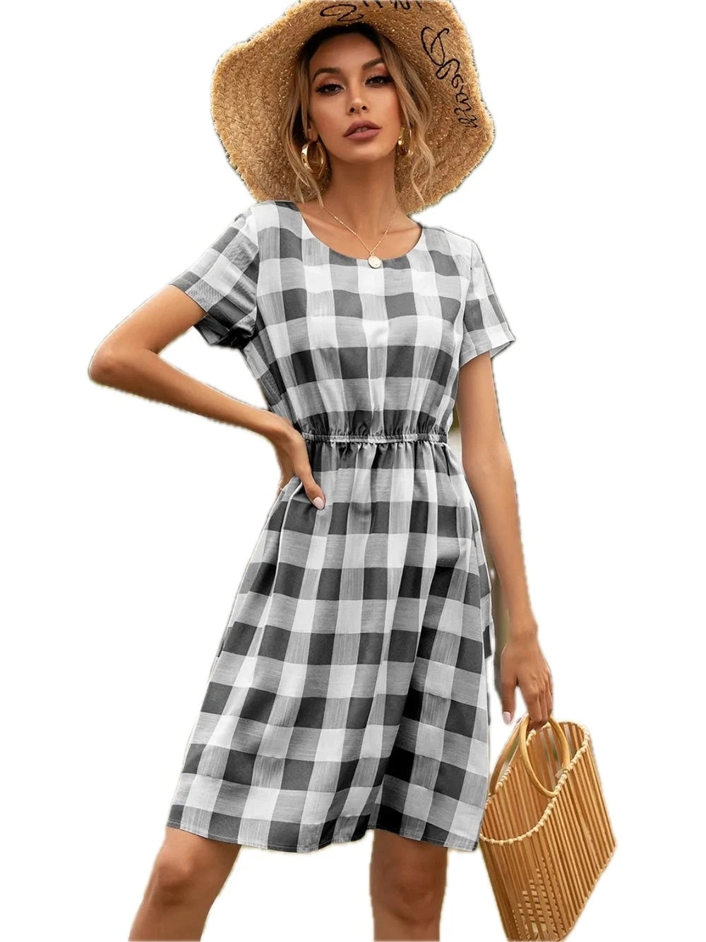 Women's Smocked Plaid Round Neck Short Sleeve Dress 100% Polyester Fabric Easy Care Lightweight Everyday Wear