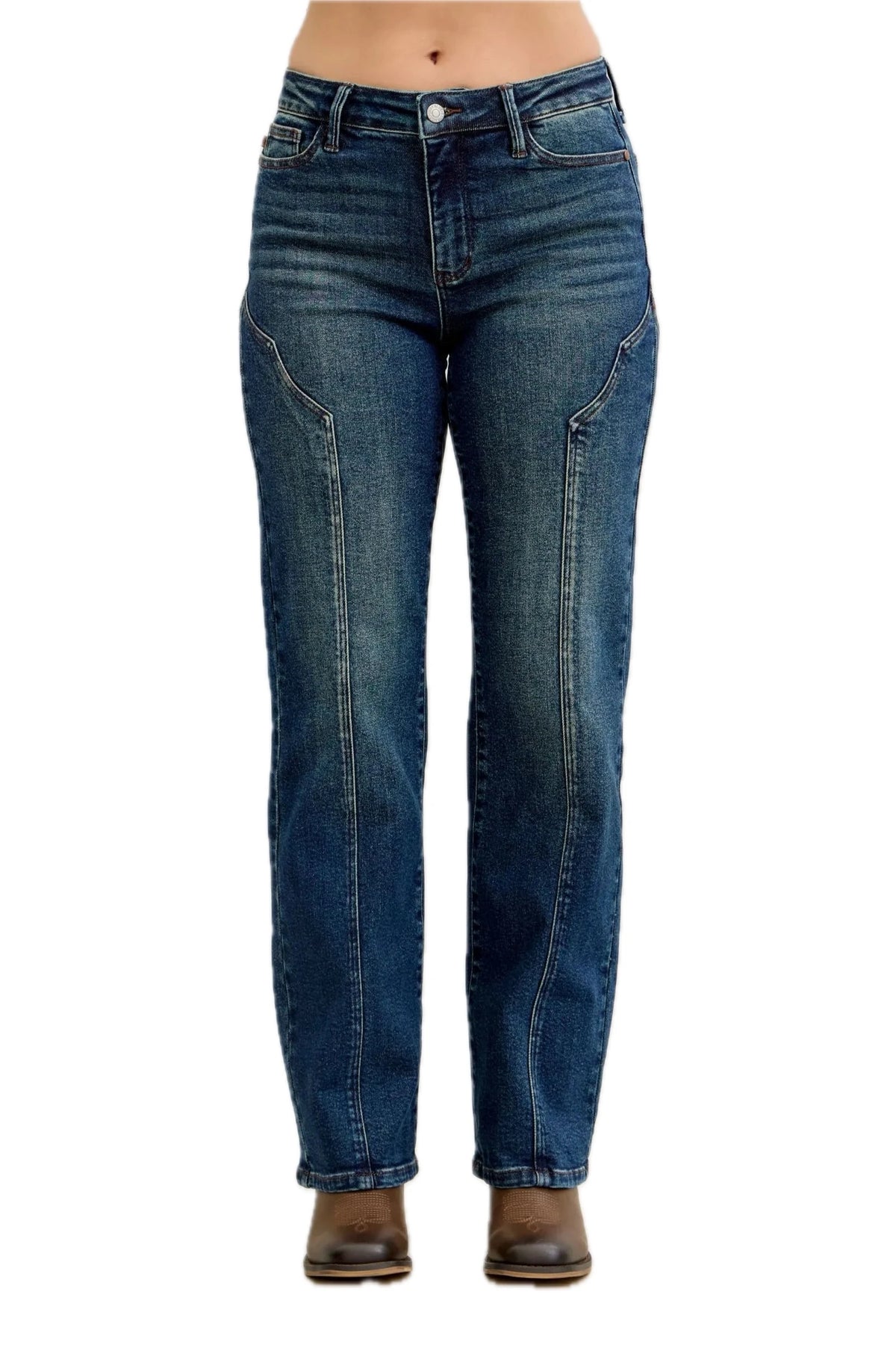 Womens Plus Size High Waisted Straight Leg Jeans in Classic Vintage Blue Wash Denim with Seam Detail and Versatile Fit