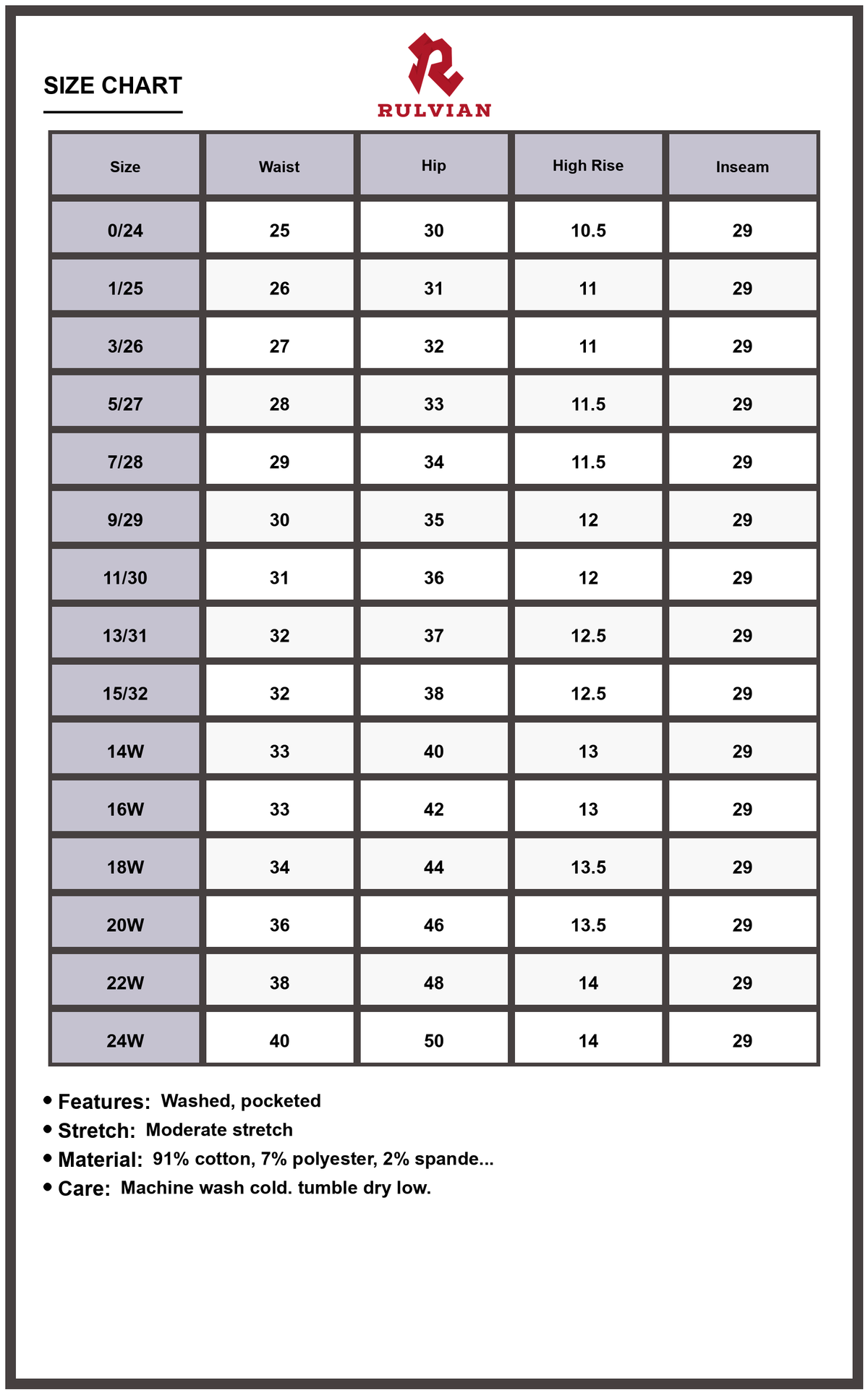 Size | Waist | Hip | High Rise | Inseam |