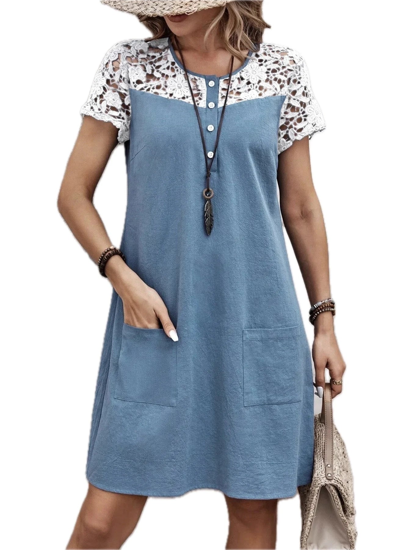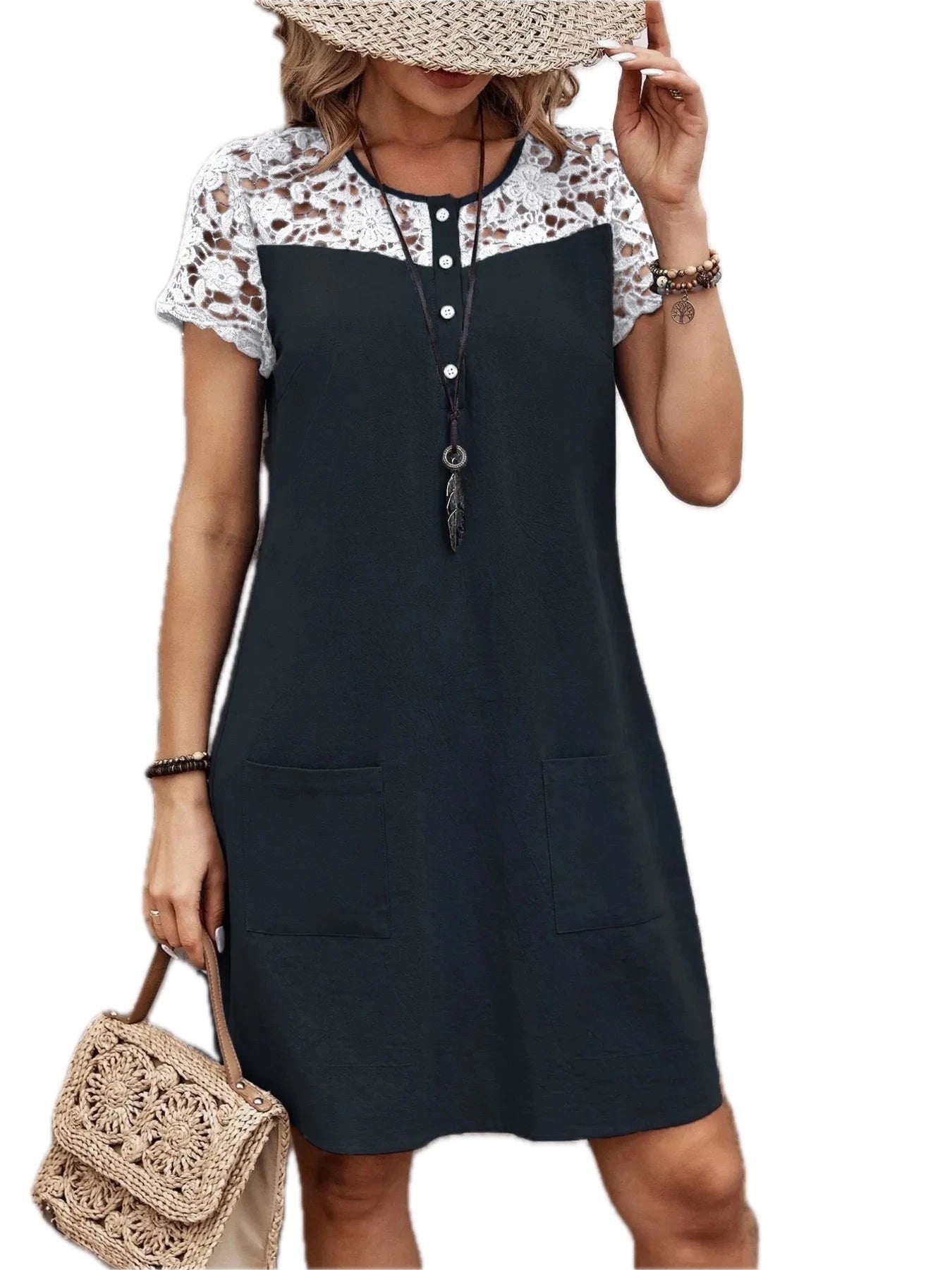 Women's Lace Button Detail Round Neck Mini Dress 100% Polyester Lightweight Silhouette for Day to Night Everyday Wear