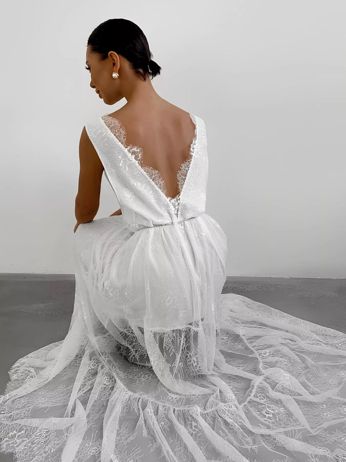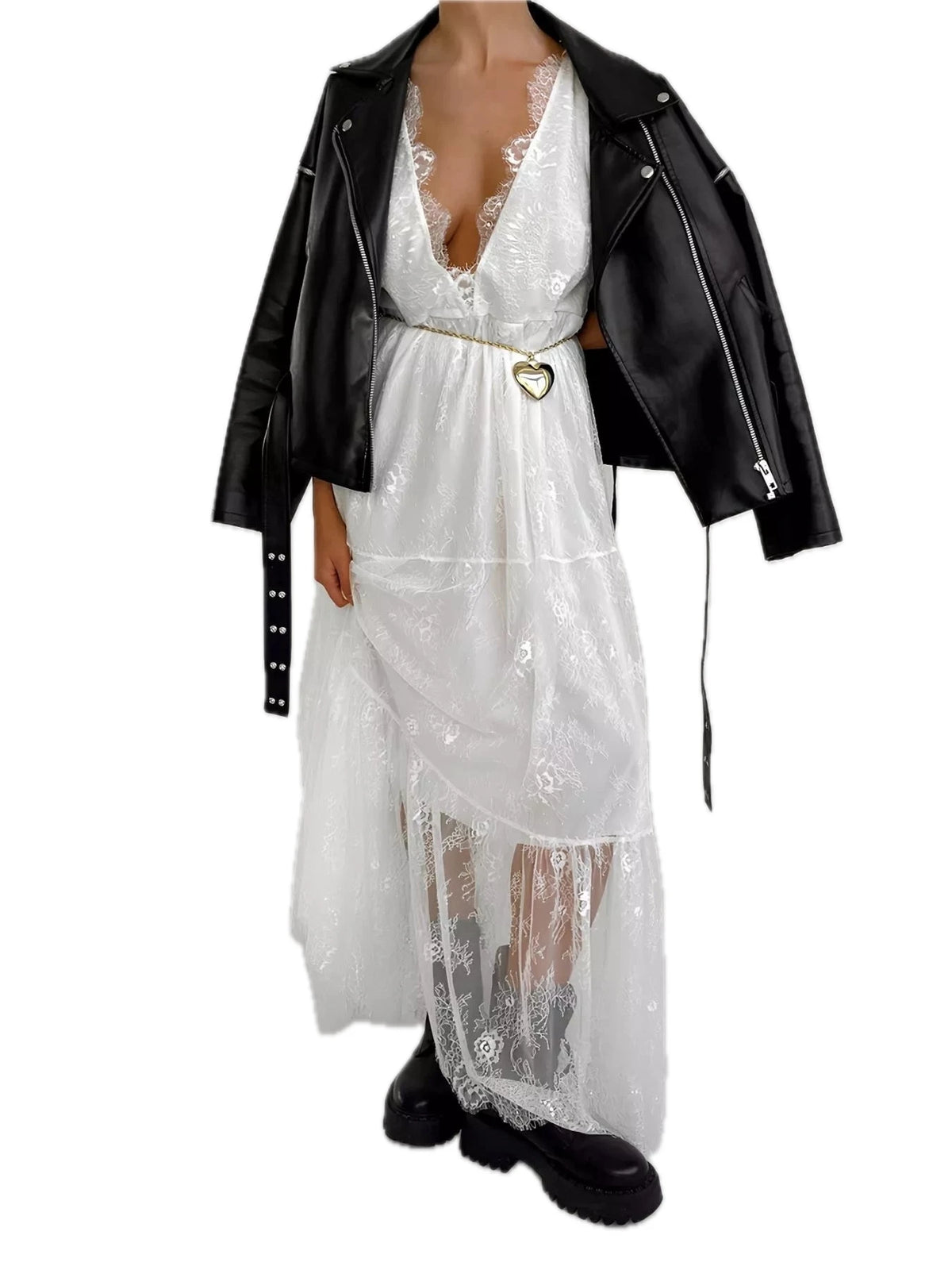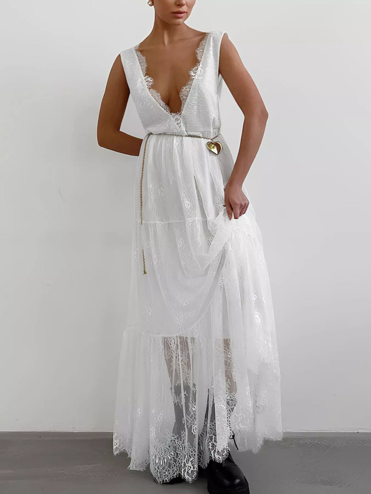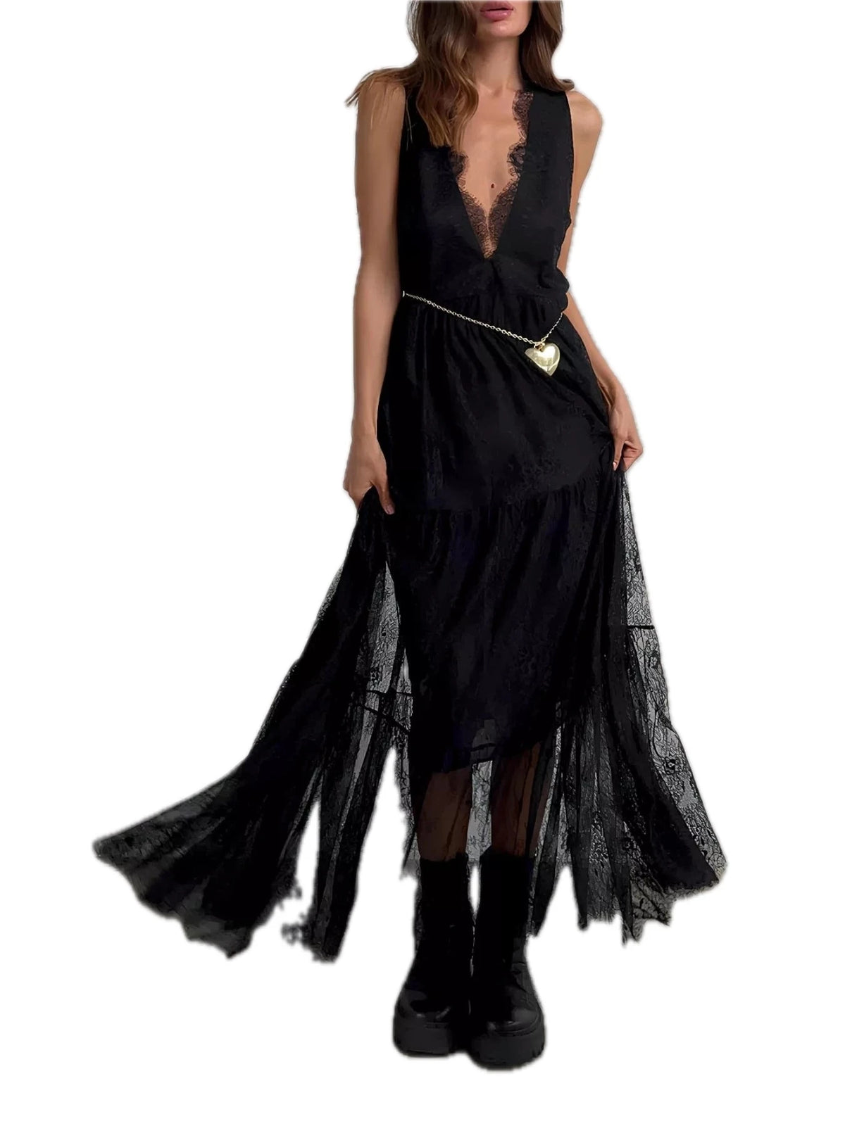 Women's Lace Deep V-Neck Maxi Dress Sheer Backless 100% Nylon Fabric Elegant Floor Length Evening Gown for Evening Event