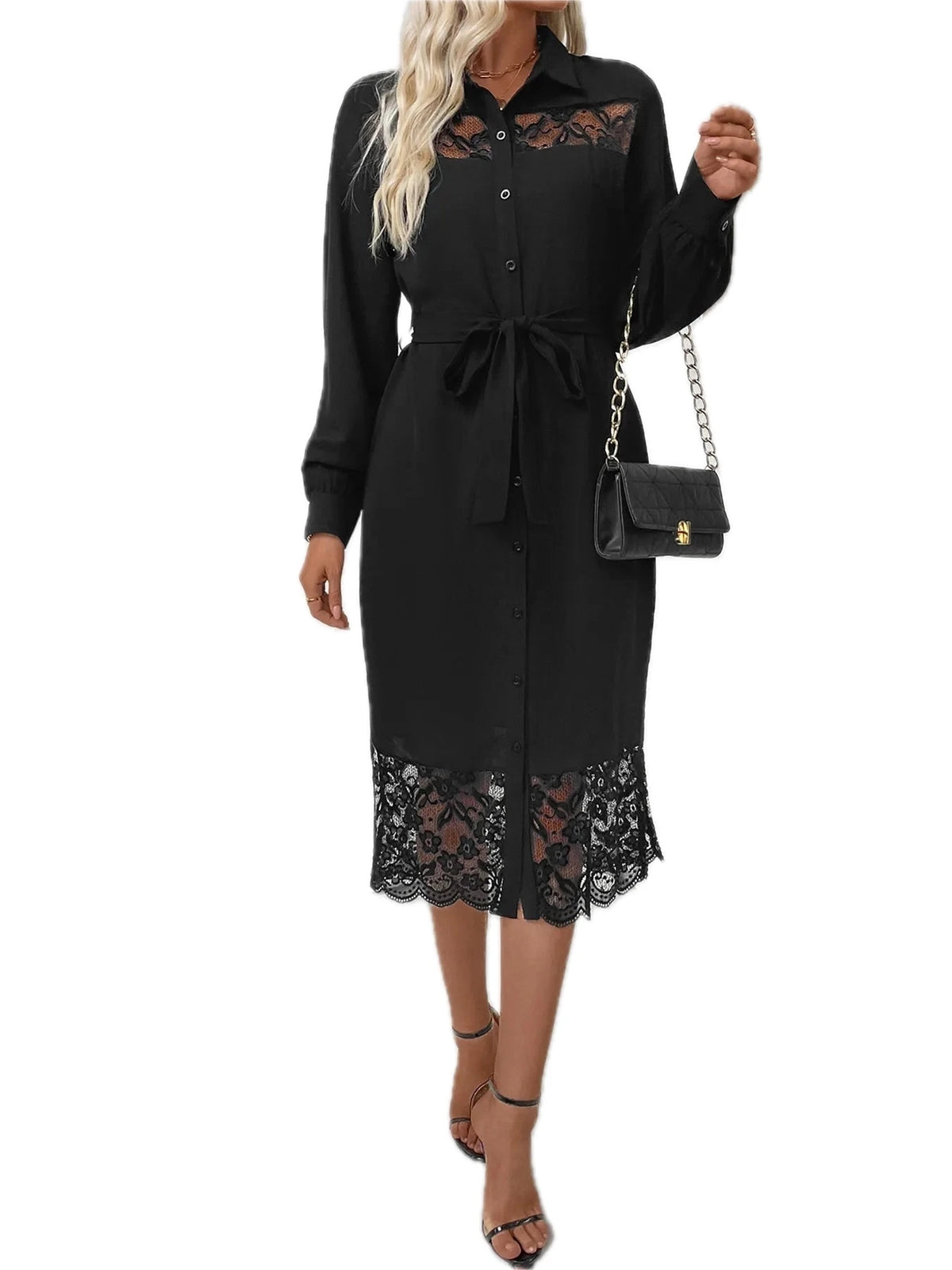 Women's Lace Detail Button Front Midi Dress 100% Polyester Belted Slit Stretch for Everyday Elegant Wear Chic Glam