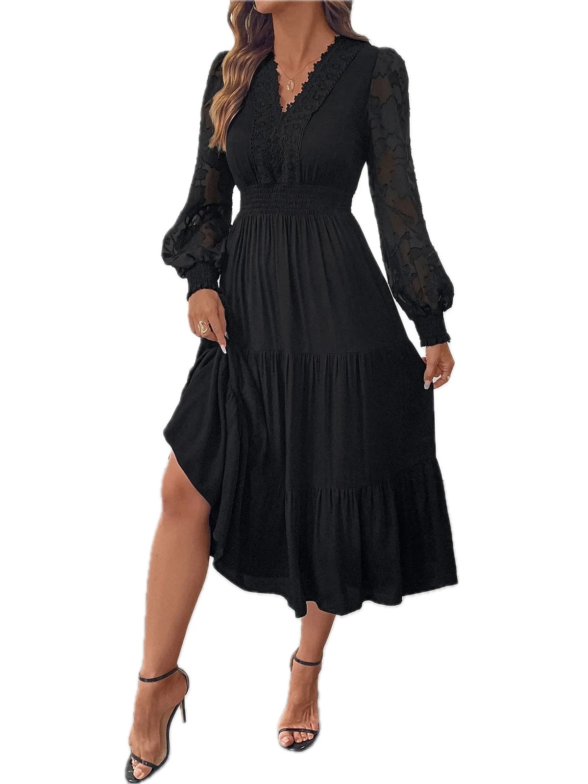 Women's Lace Detail Lantern Sleeve Tiered Dress 100% Polyester Fabric with Ruched Bodice and Flowy Skirt for Party Wear