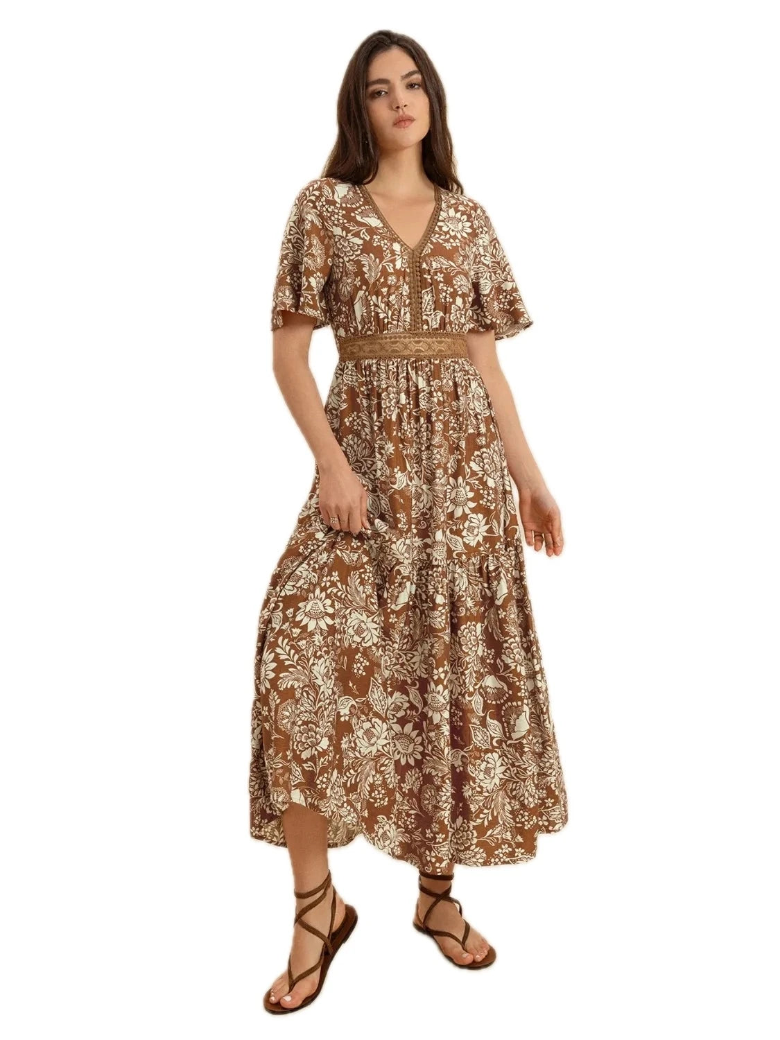 Women's Lace Detail Printed Short Sleeve Midi Dress with Delicate Ruched Effect in 100% Viscose for Everyday Elegant Occasions