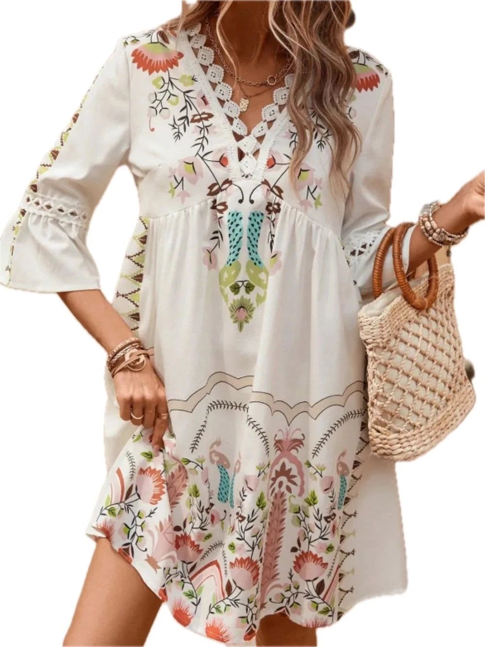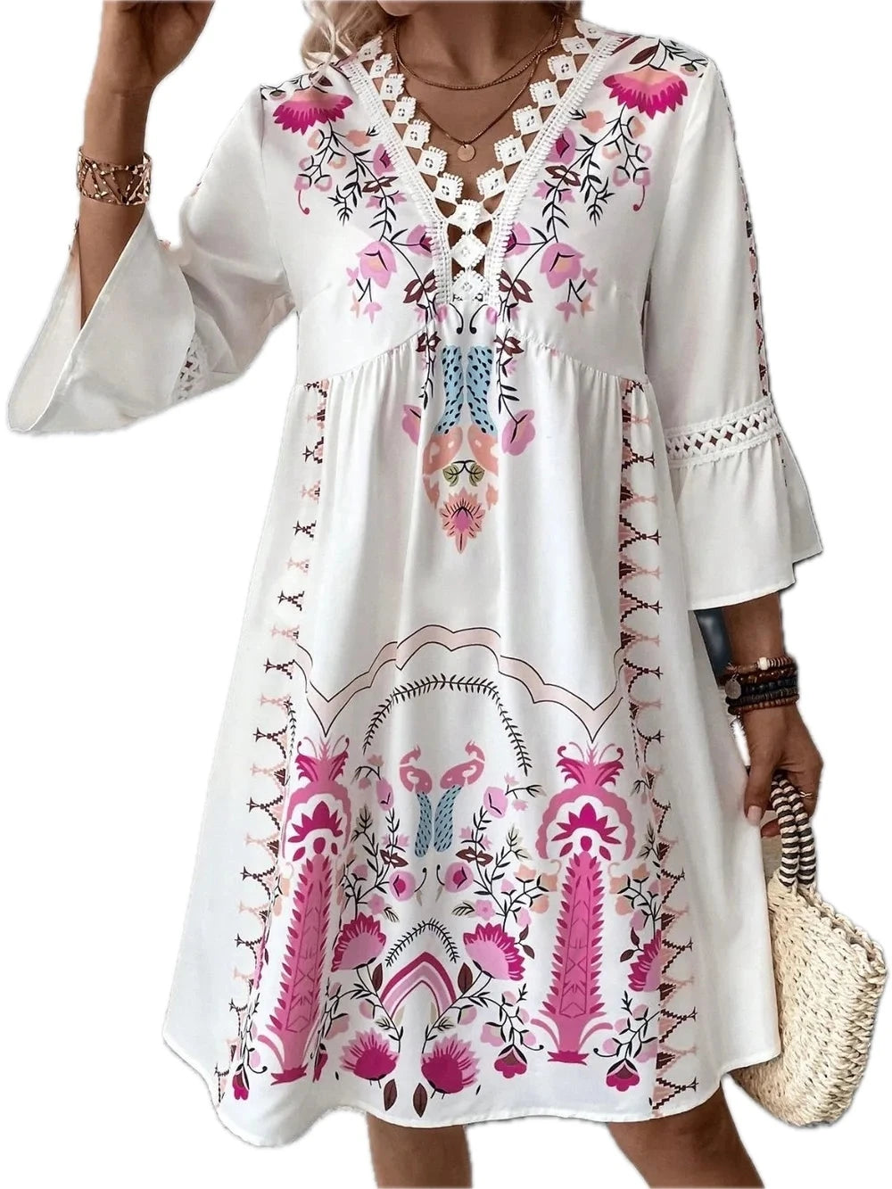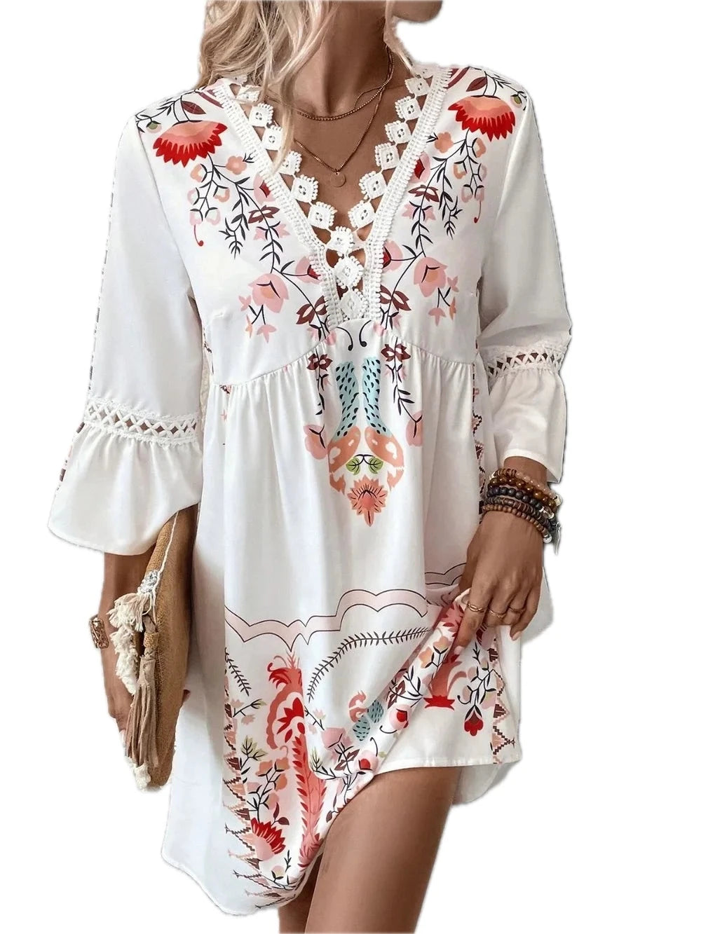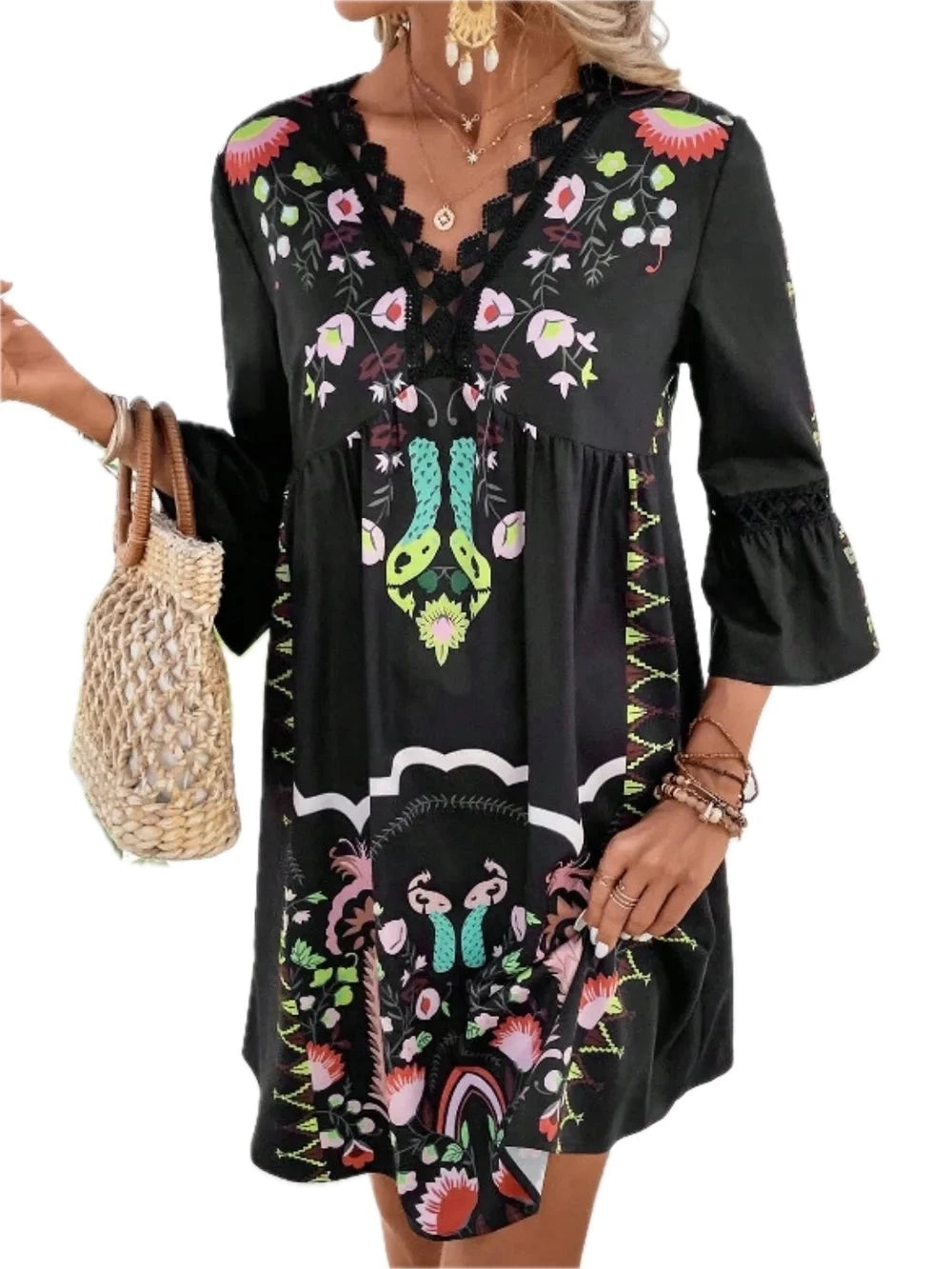 Women's Lace Detail Printed Three Quarter Sleeve Dress with 100% Polyester Fabric for Versatile Occasion Wear Everyday