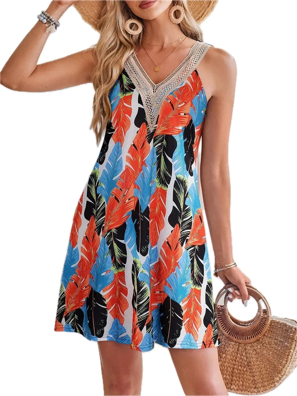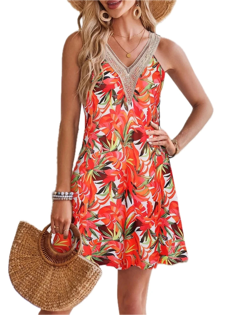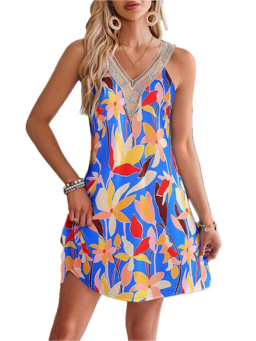 Women's Lace Detail Printed V-Neck Sleeveless Dress with Sheer Overlay and 100% Polyester for Elegant Summer Occasion