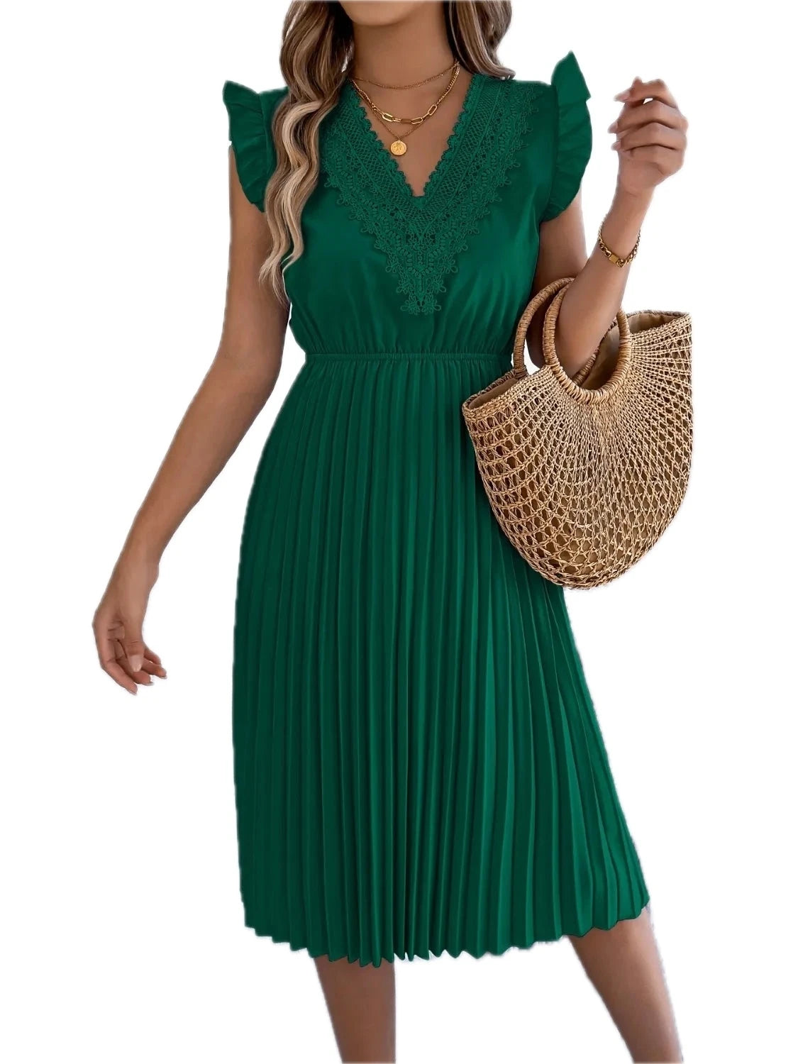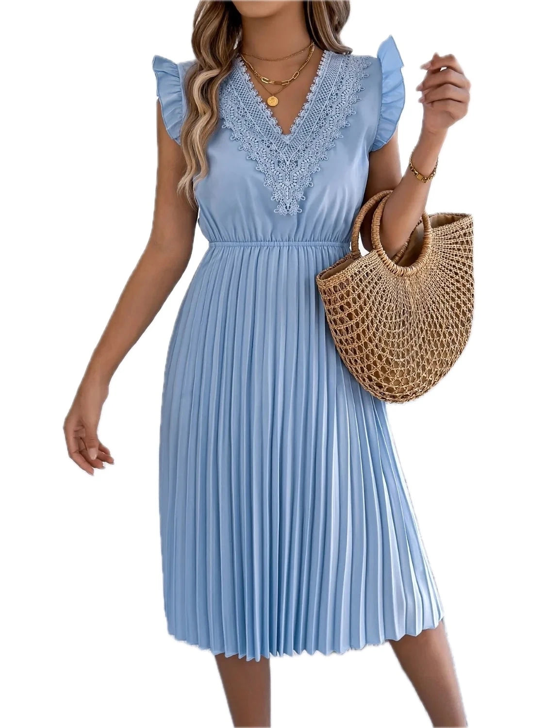 Women's Lace Detail Ruffled Cap Sleeve Pleated Dress Perfect for Elegant Evening Occasion 95% Polyester 5% Elastane