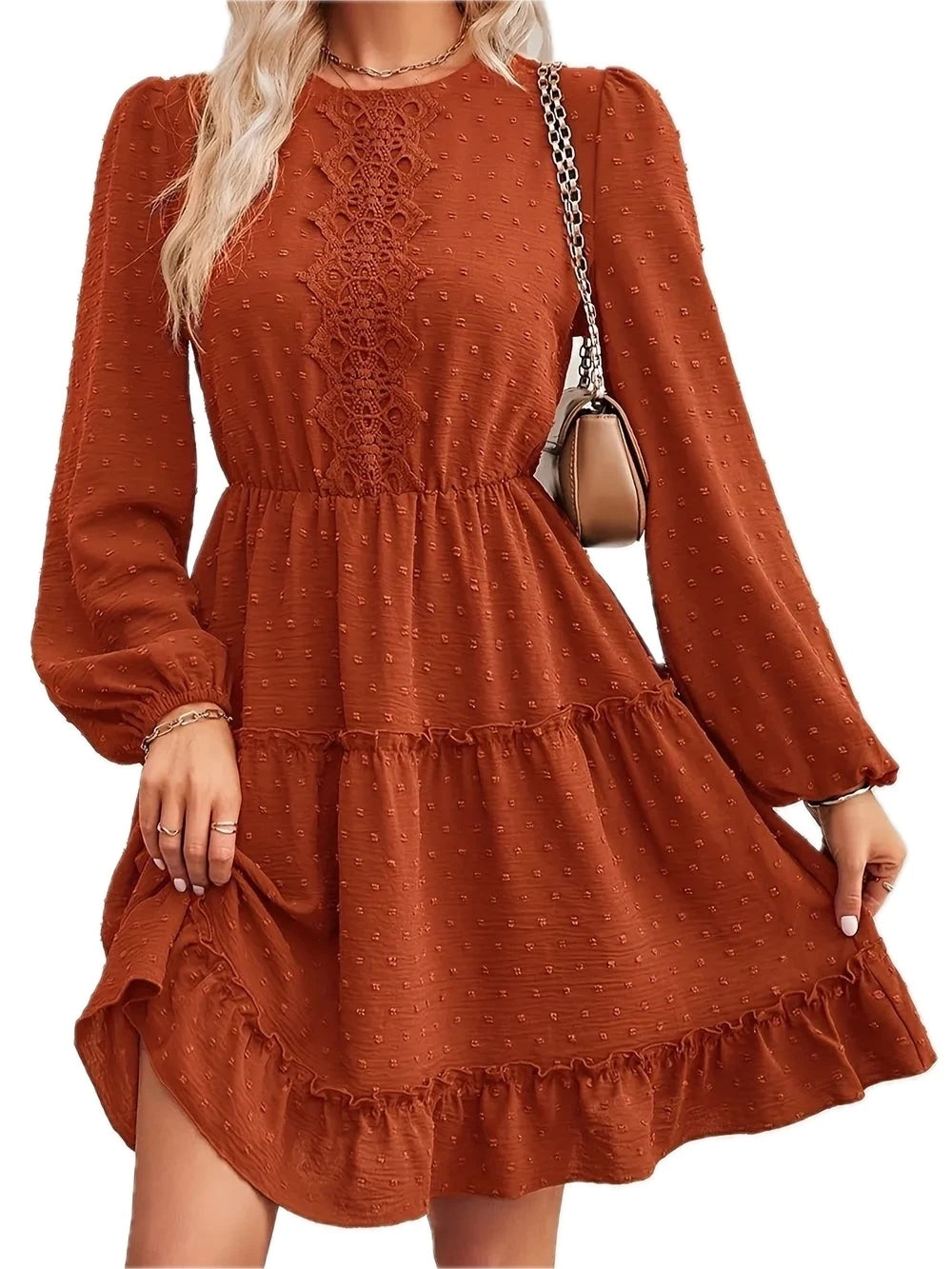 Women's Lace Detail Swiss Dot Round Neck Mini Dress 100% Polyester Fabric Sheer Overlay Elegant Everyday Wear Casual