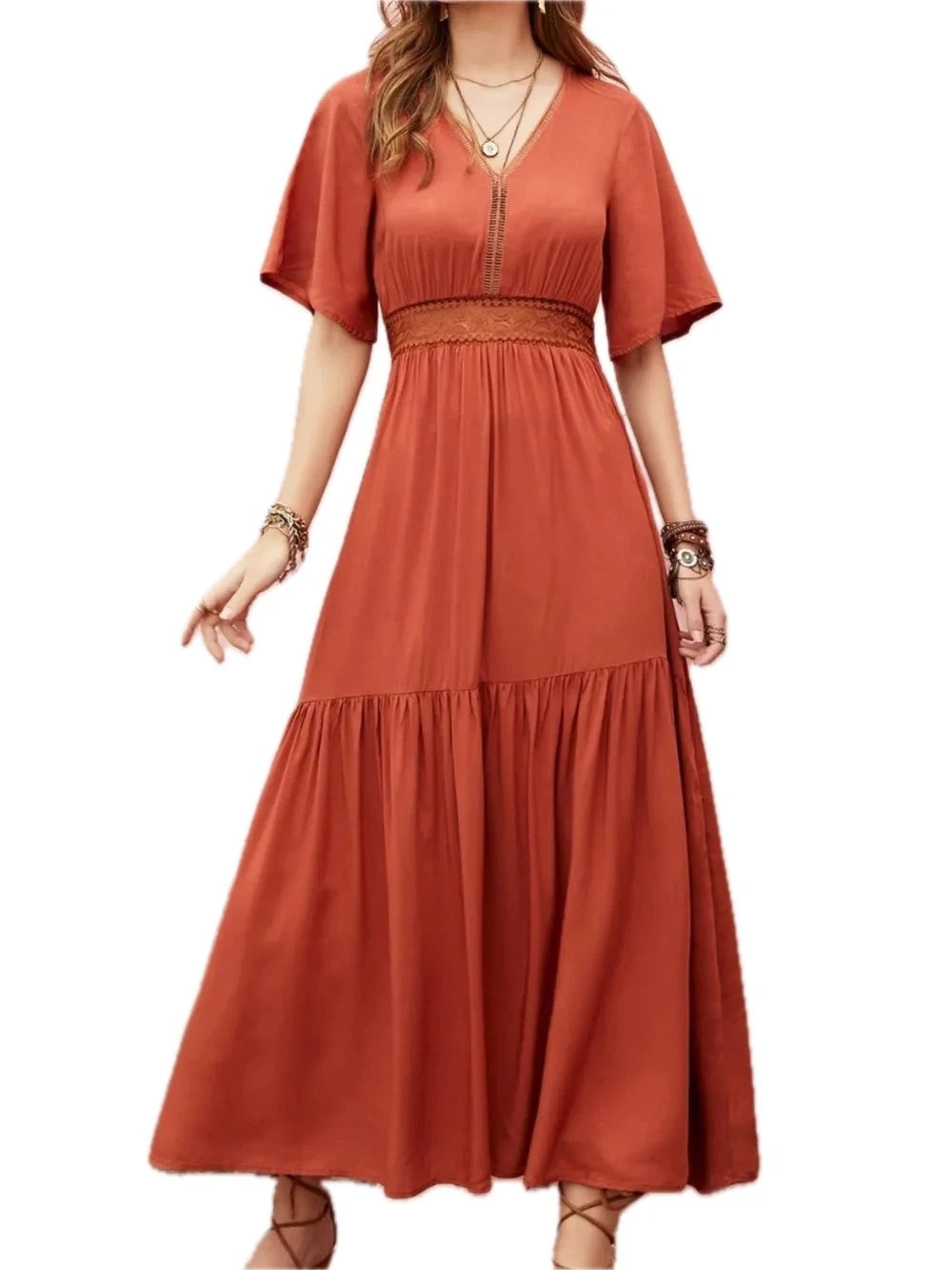 Women's Lace Detail V Neck Half Sleeve Midi Dress 100% Viscose Fabric Sheer Stretch for Elegant Day to Night Now