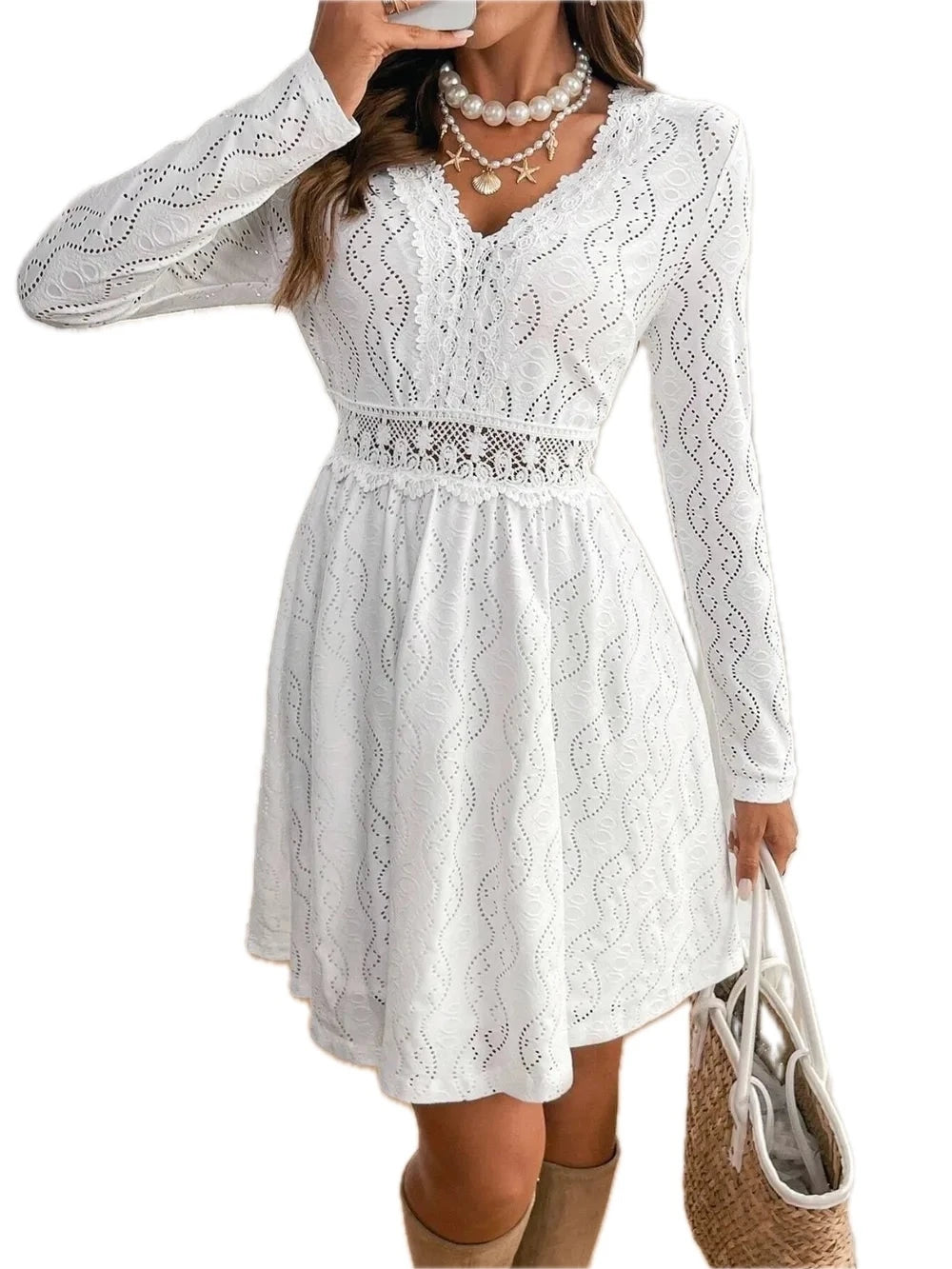 Women's Lace Detail V Neck Long Sleeve Mini Dress Ninety five percent polyester and five percent elastane Sheer Stretch