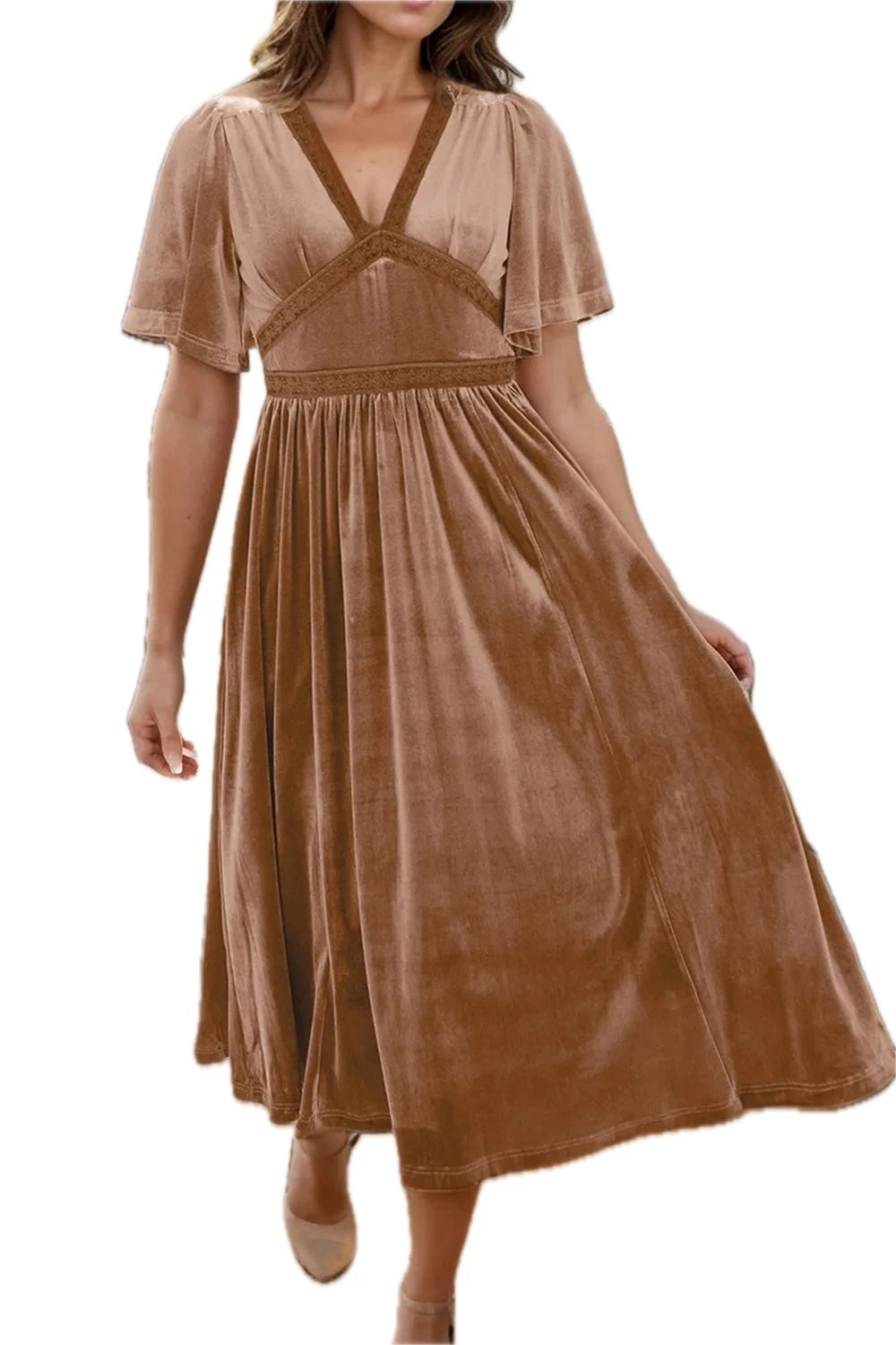 Women's Lace Detail V Neck Short Sleeve Dress with Sheer Overlay and Subtle Stretch 95% Polyester 5% Elastane Fabric