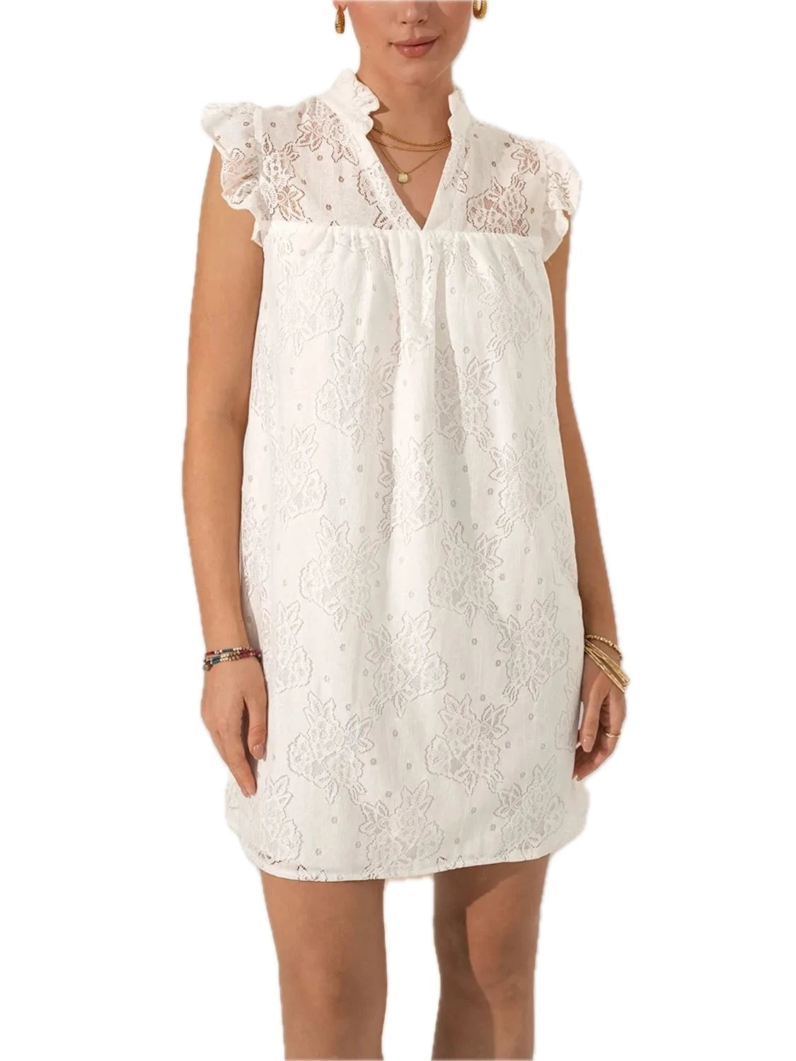 Women's Lace Notched Cap Sleeve Mini Dress with Delicate Ruffle Lace Detail Elegant Everyday 70% viscose 30% polyamide