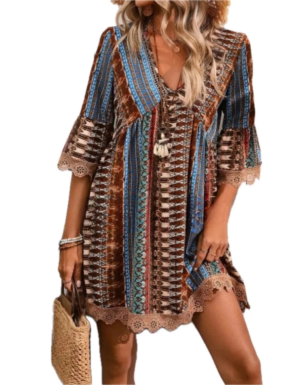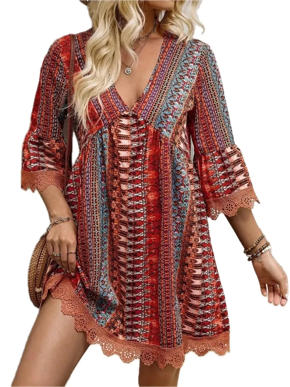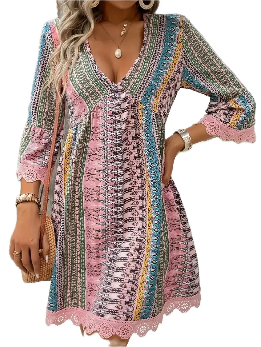 Women's Lace Trim Printed V Neck Three Quarter Sleeve Dress 95% Polyester 5% Spandex Comfortable Everyday Wear