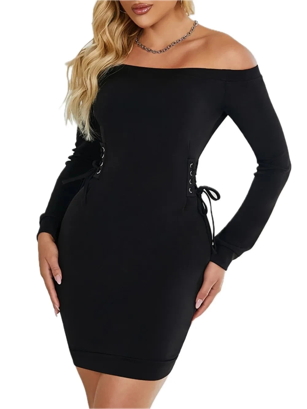 Women's Lace Up Off Shoulder Long Sleeve Mini Dress 95% Polyester 5% Spandex Sheer Bodice Not Lined Great for Party Wear