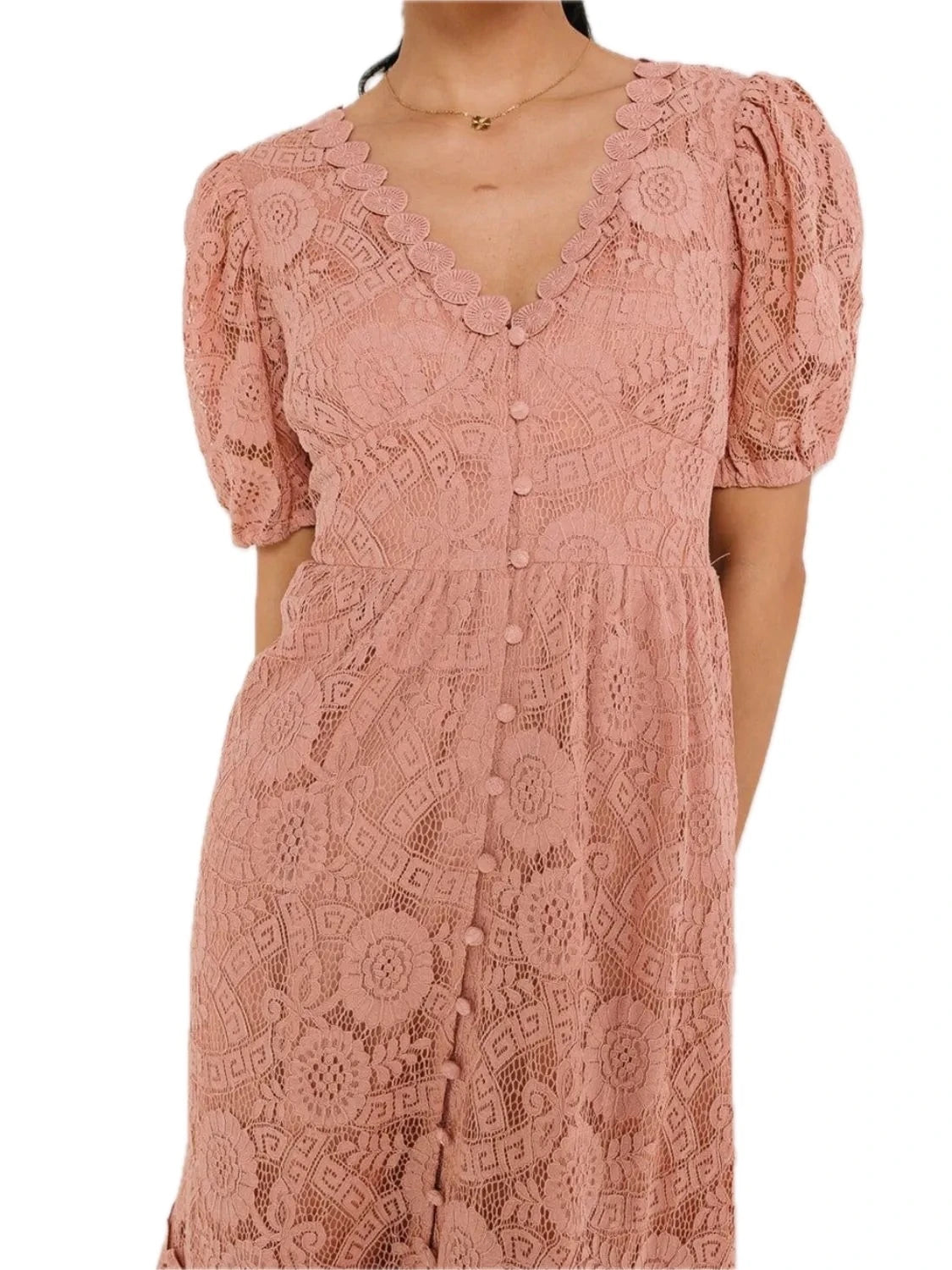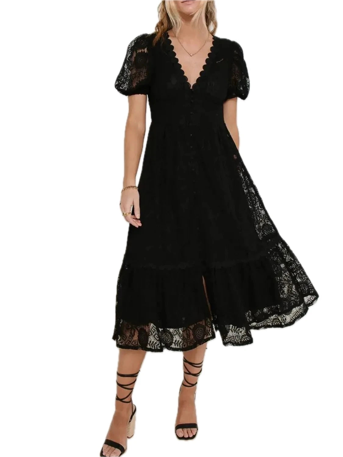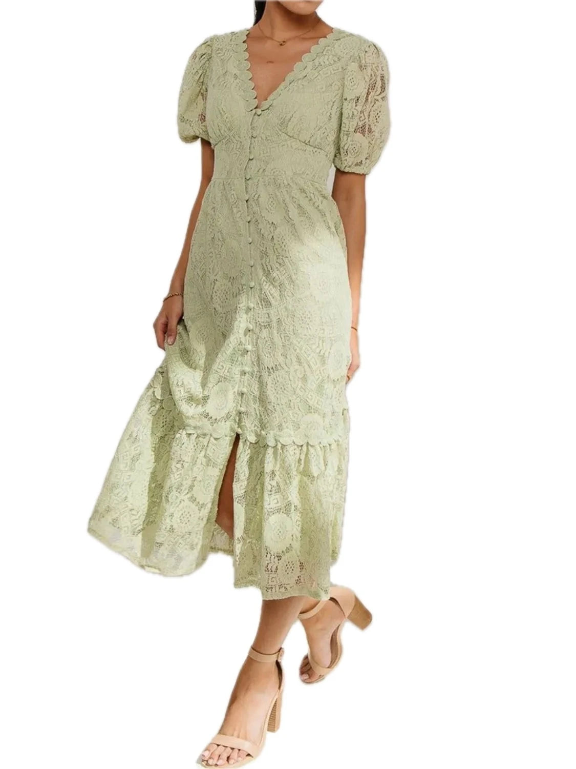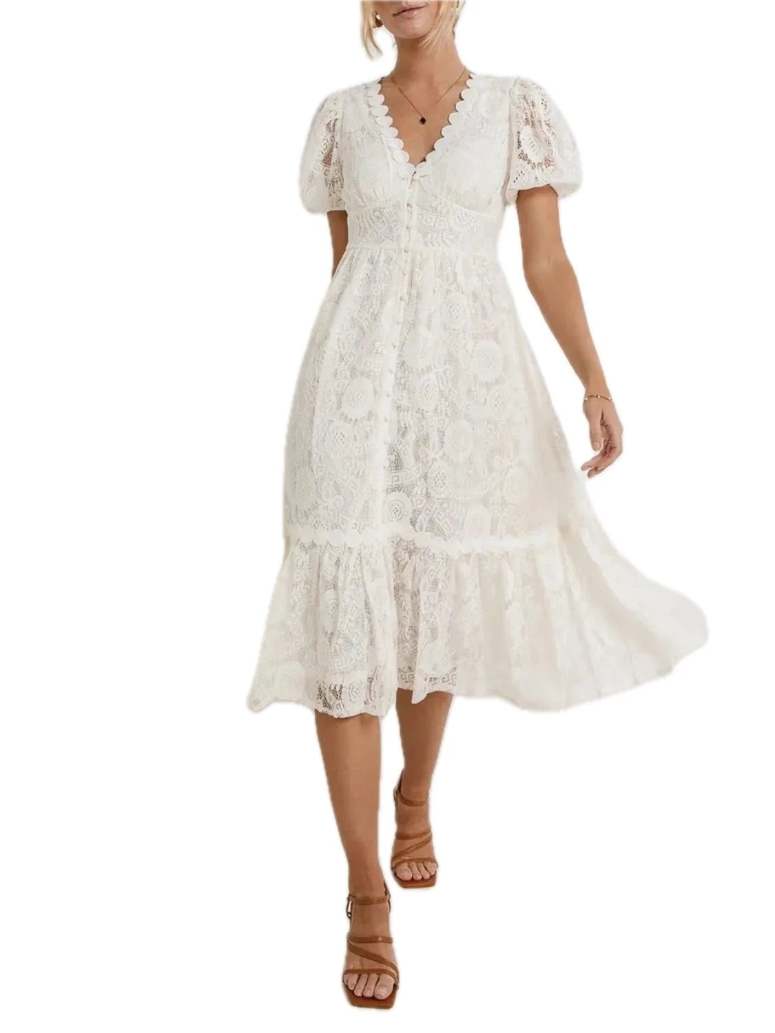 Women's Lace V-Neck Short Sleeve Dress with Buttoned Front and Side Slit 95% Polyester and 5% Spandex For All Occasions