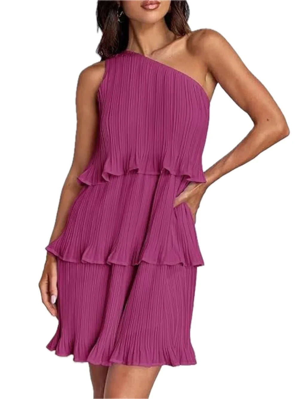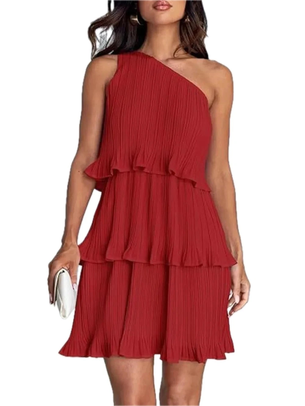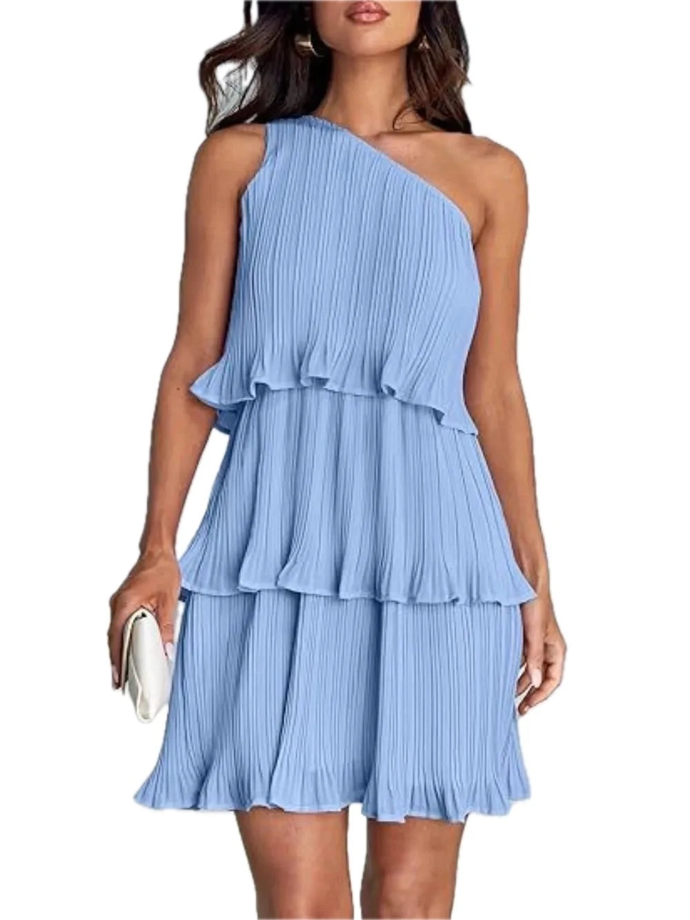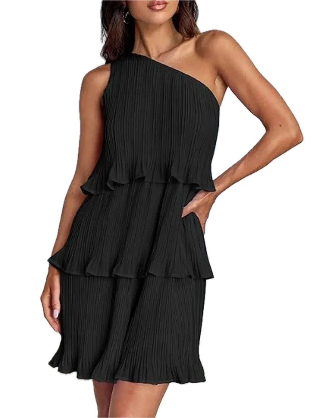 Women's Layered Single Shoulder Mini Dress with Ruffles and Sheer Overlay 100% Polyester Light Stretch and Easy Care