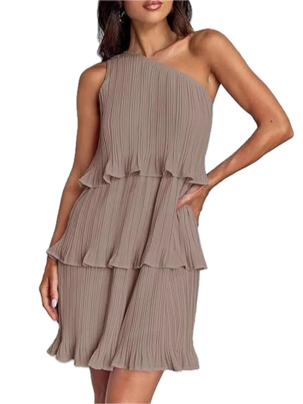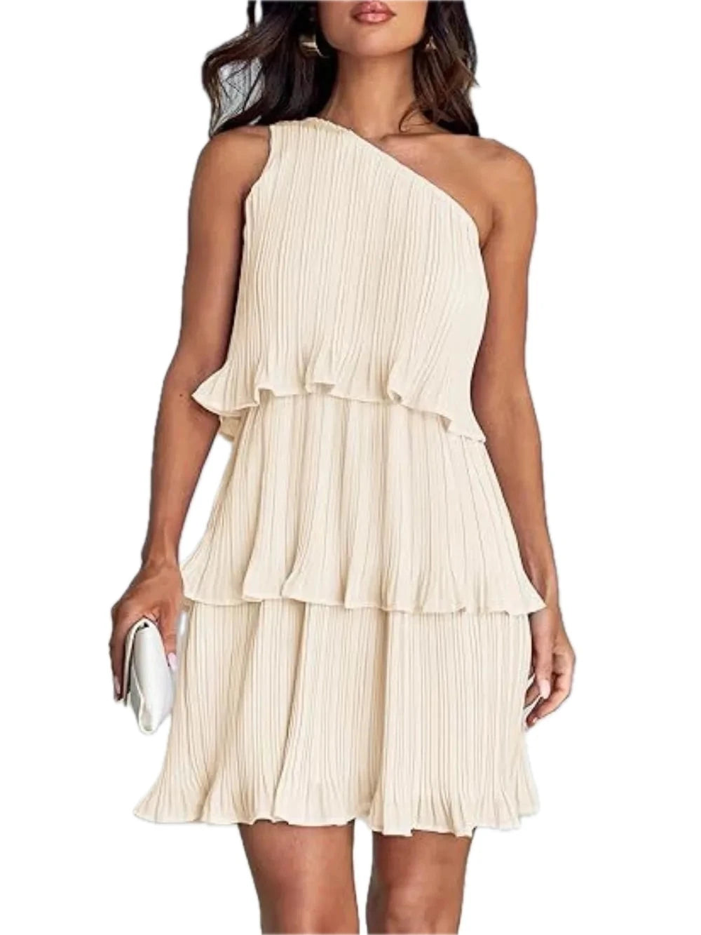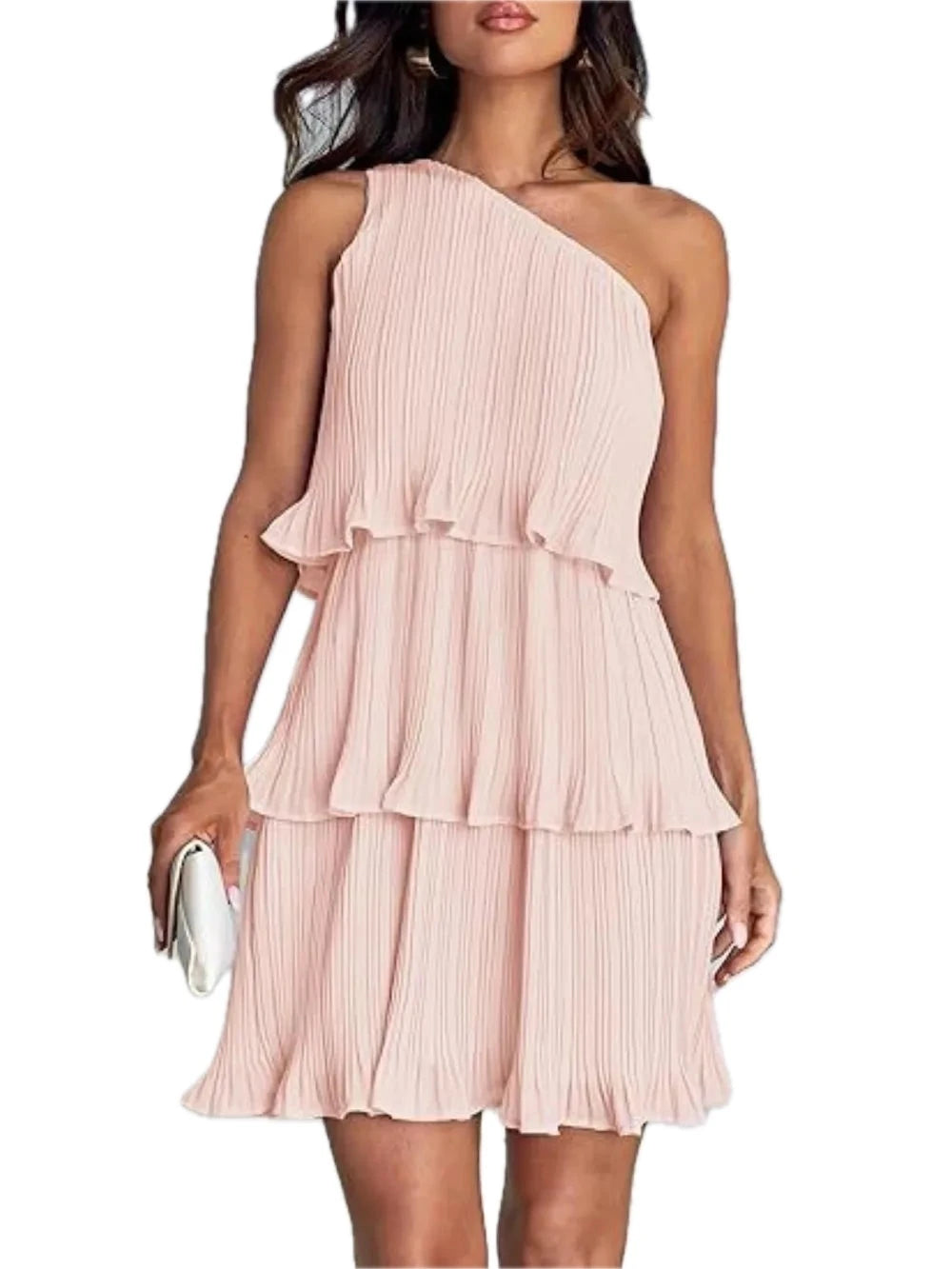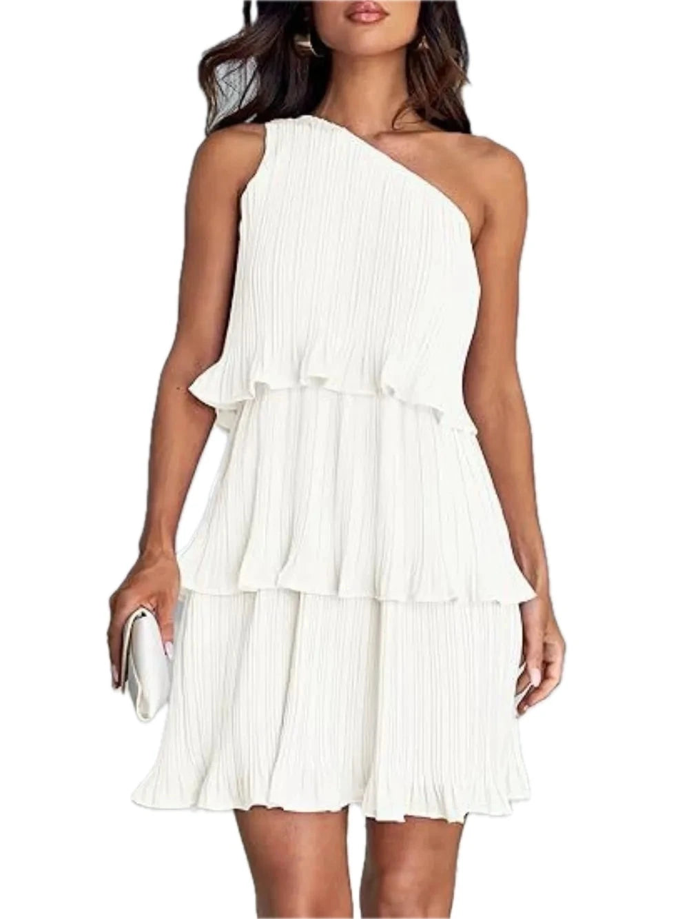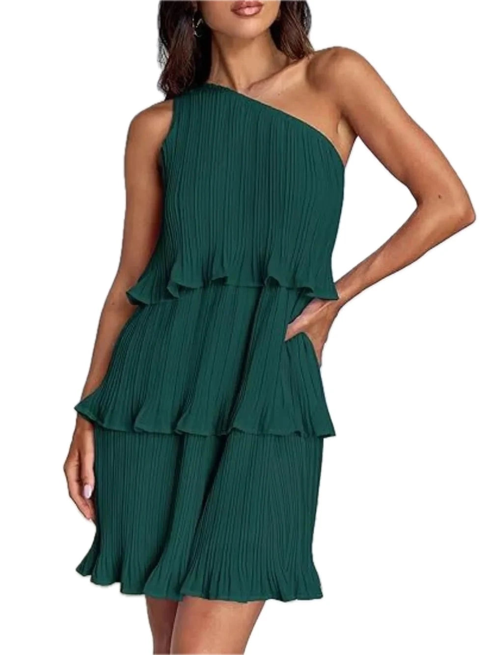 Women's Layered Single Shoulder Mini Dress with Ruffles and Sheer Overlay 100% Polyester Light Stretch and Easy Care