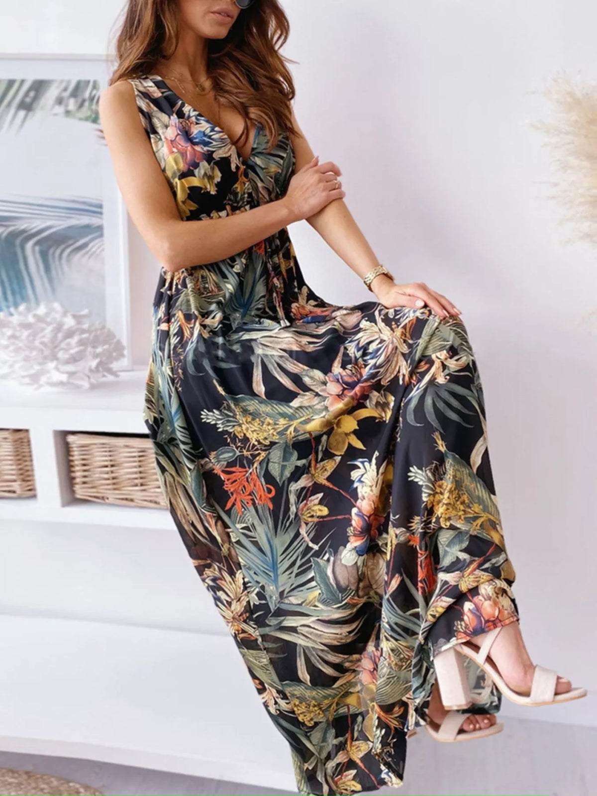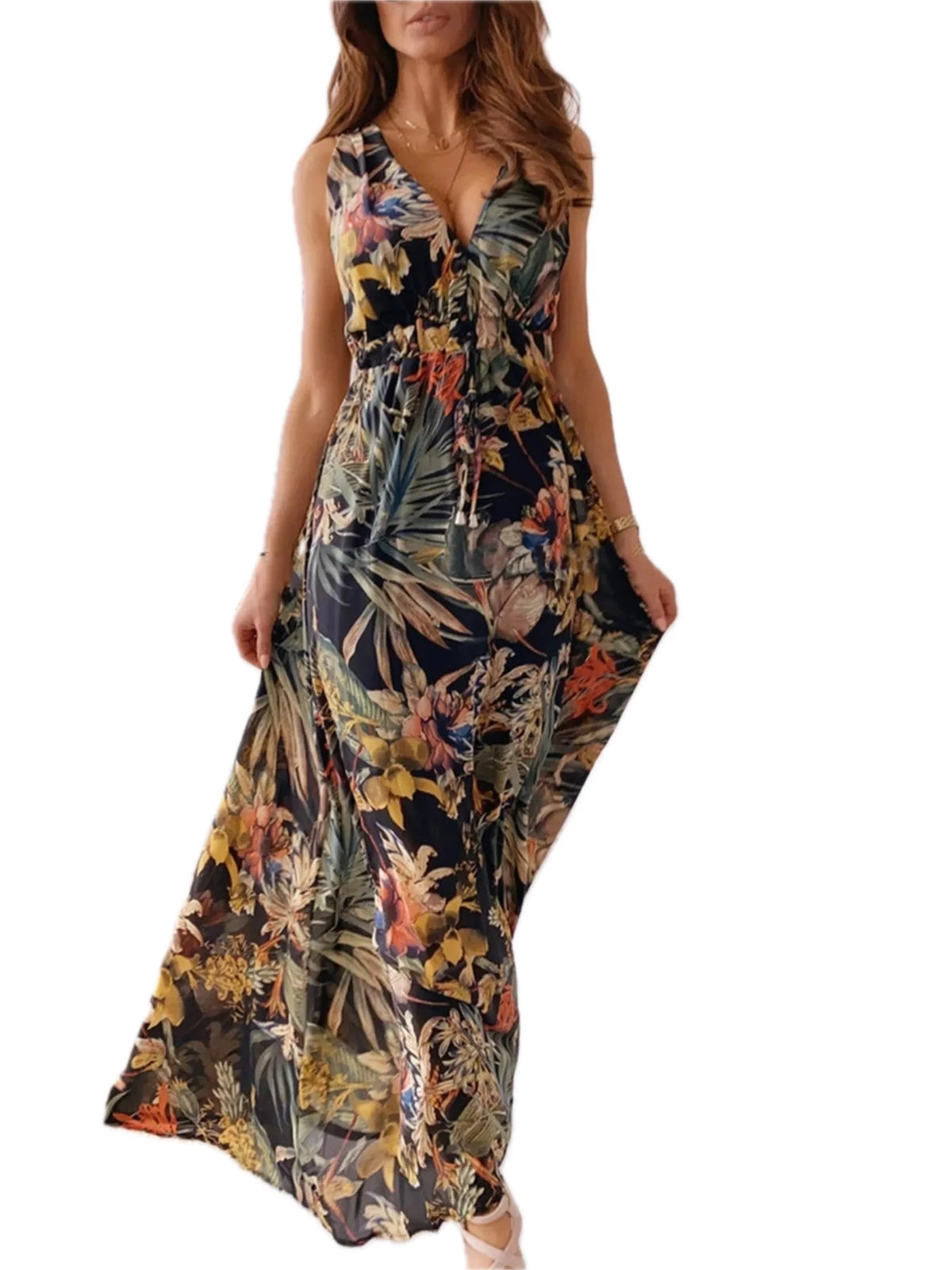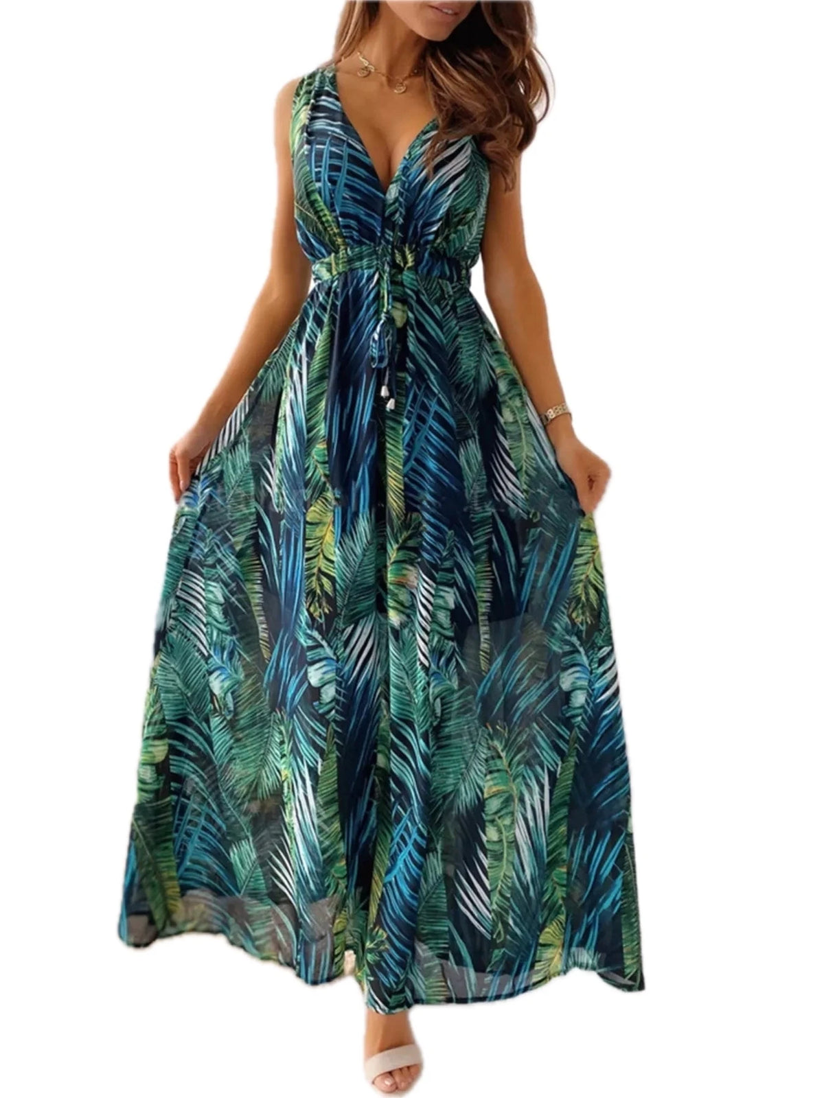 Women's Leaf Print Sleeveless Maxi Dress 100% Polyester Floor Length Casual Day to Night Outfit Perfect for Summer Wear