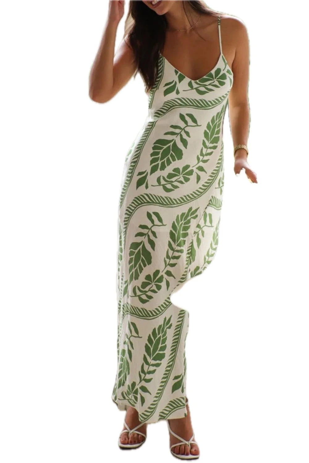 Women's Leaf Print Slit V Neck Midi Cami Dress with Flowing Silhouette and Easy Care 95% Polyester 5% Spandex Fabric