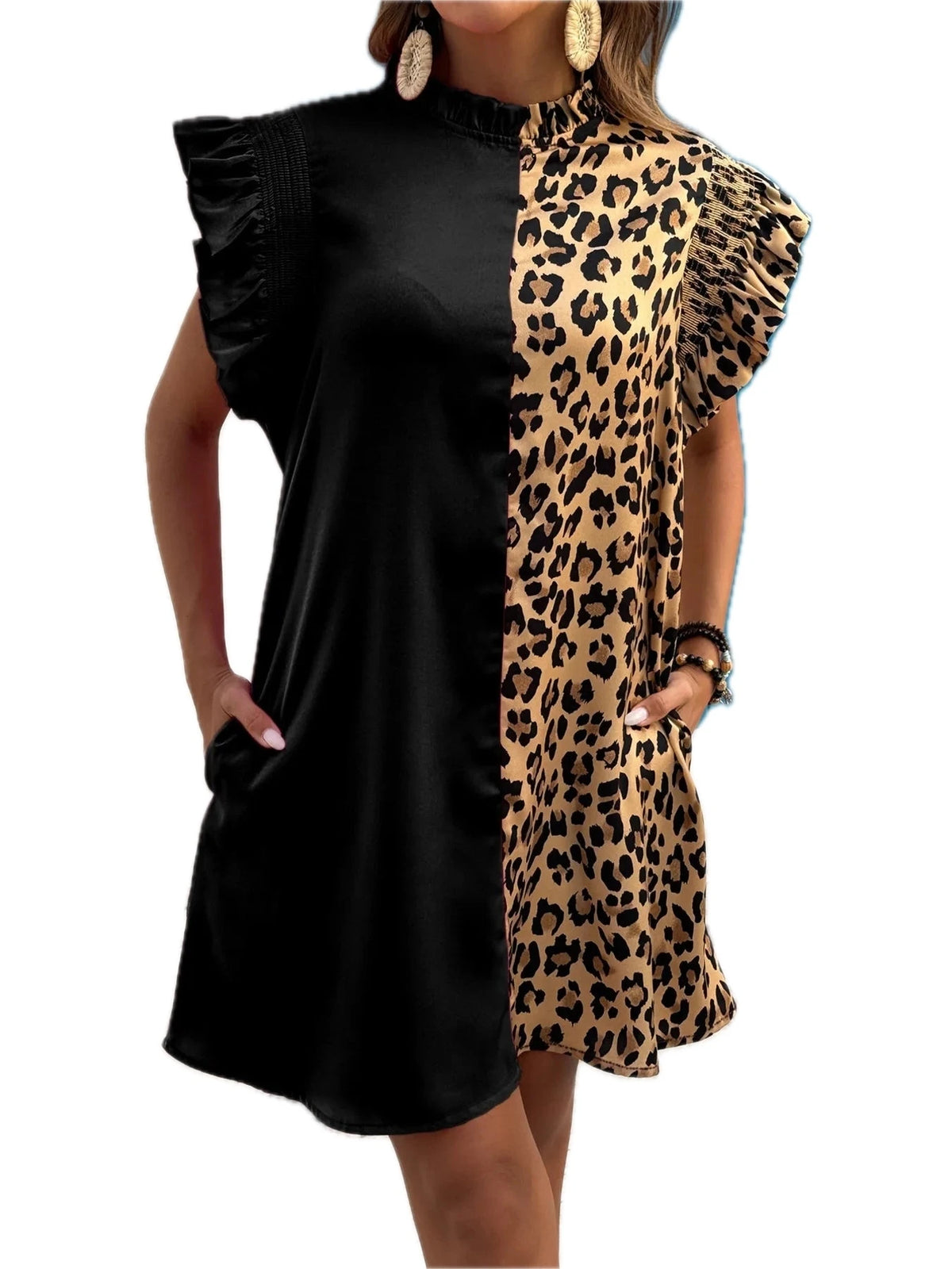 Women's Leopard Color Block Ruffle Sleeve Dress with Pockets Frill Smocked Stretch Not Lined Polyester % Casual