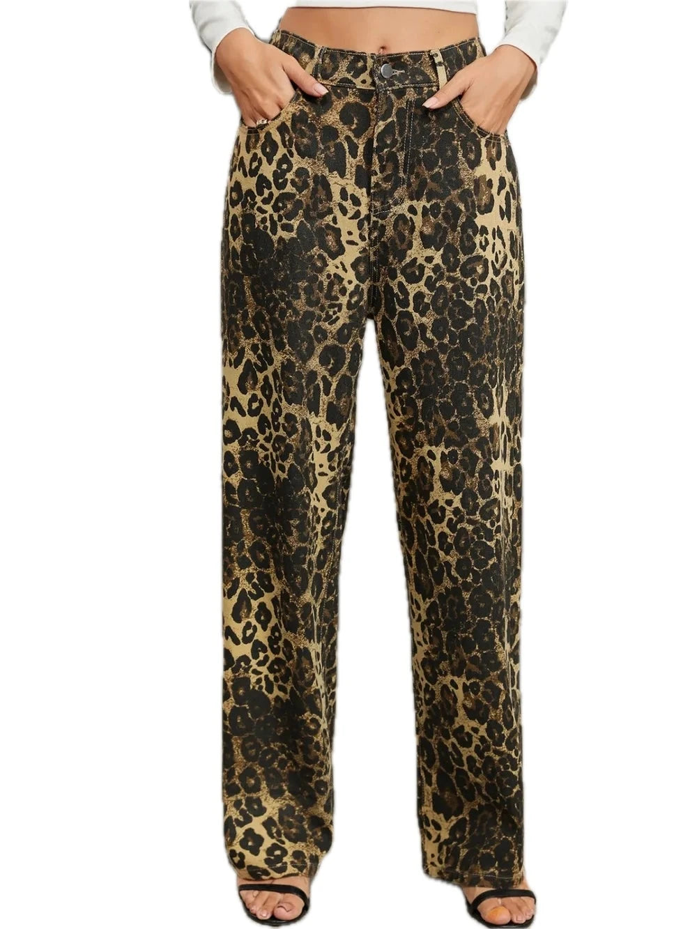 Womens Leopard Print Jeans with Front Pockets and Button Closure Casual Fashionable Durable Everyday Wear Pants