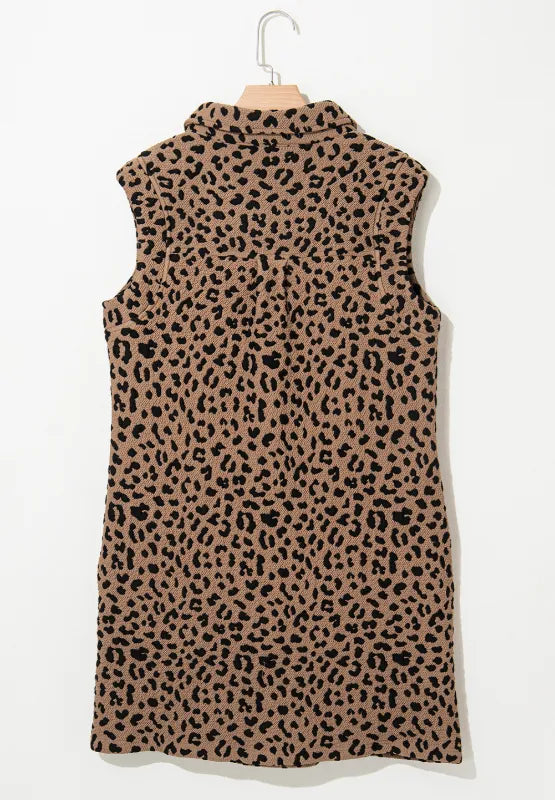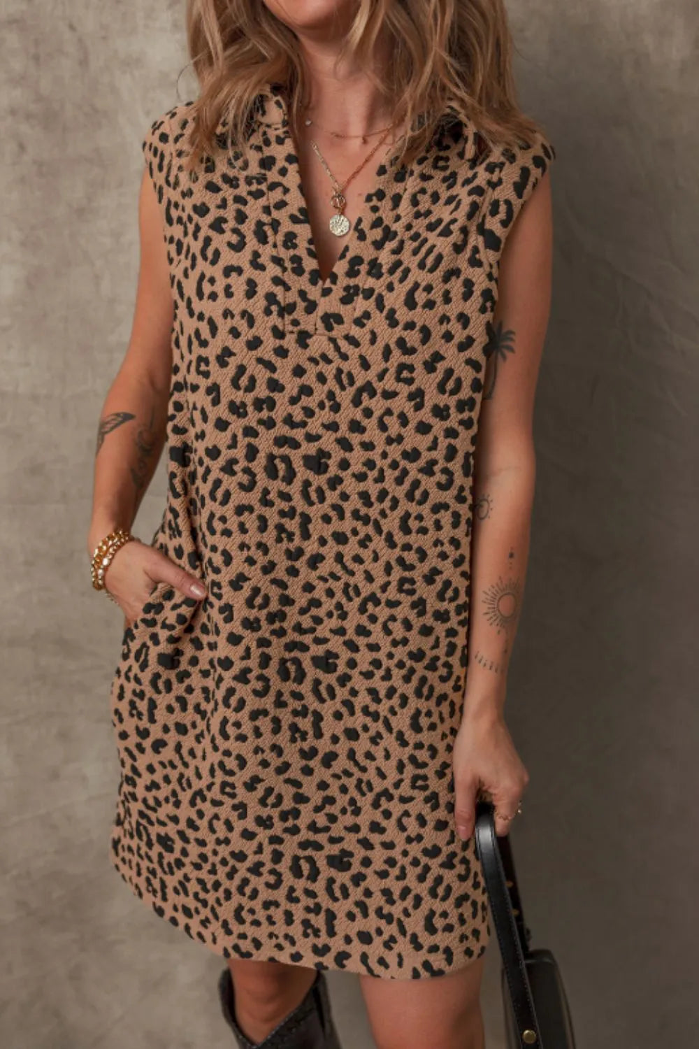 Women's Leopard Johnny Collar Sleeveless Mini Dress 95% Polyester 5% Elastane Lightweight Unlined A Line Fit Casual
