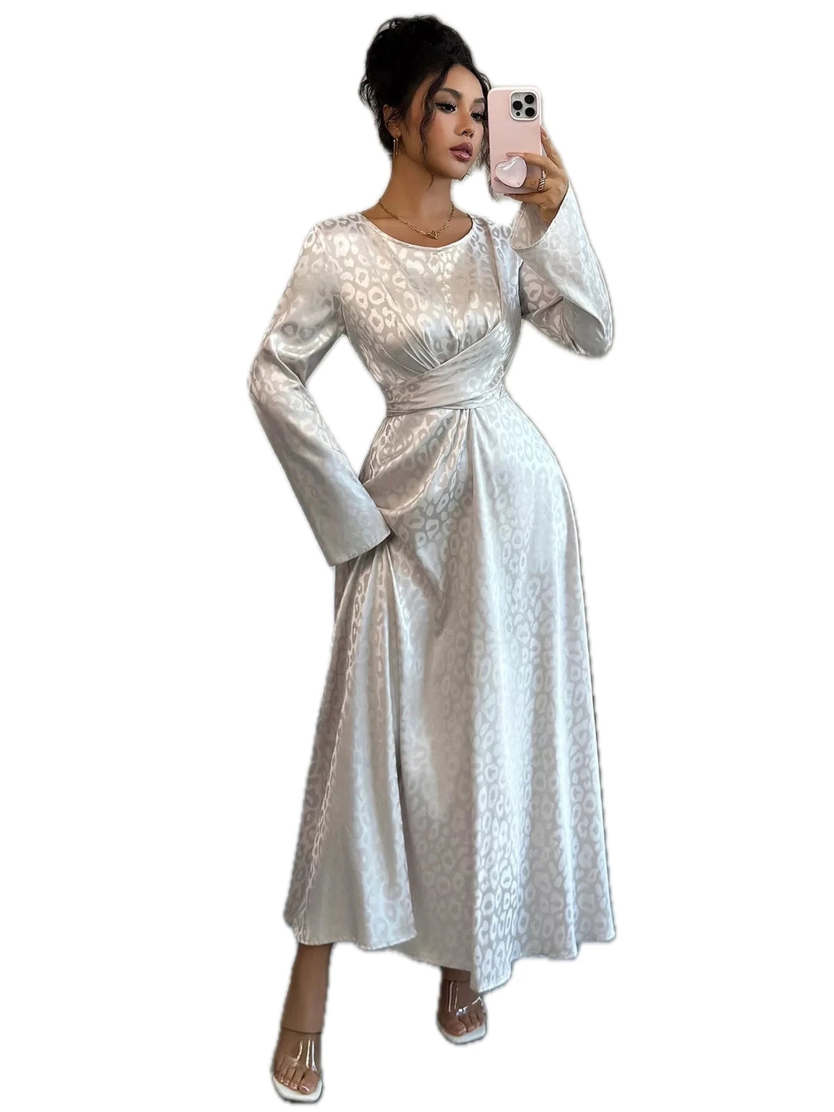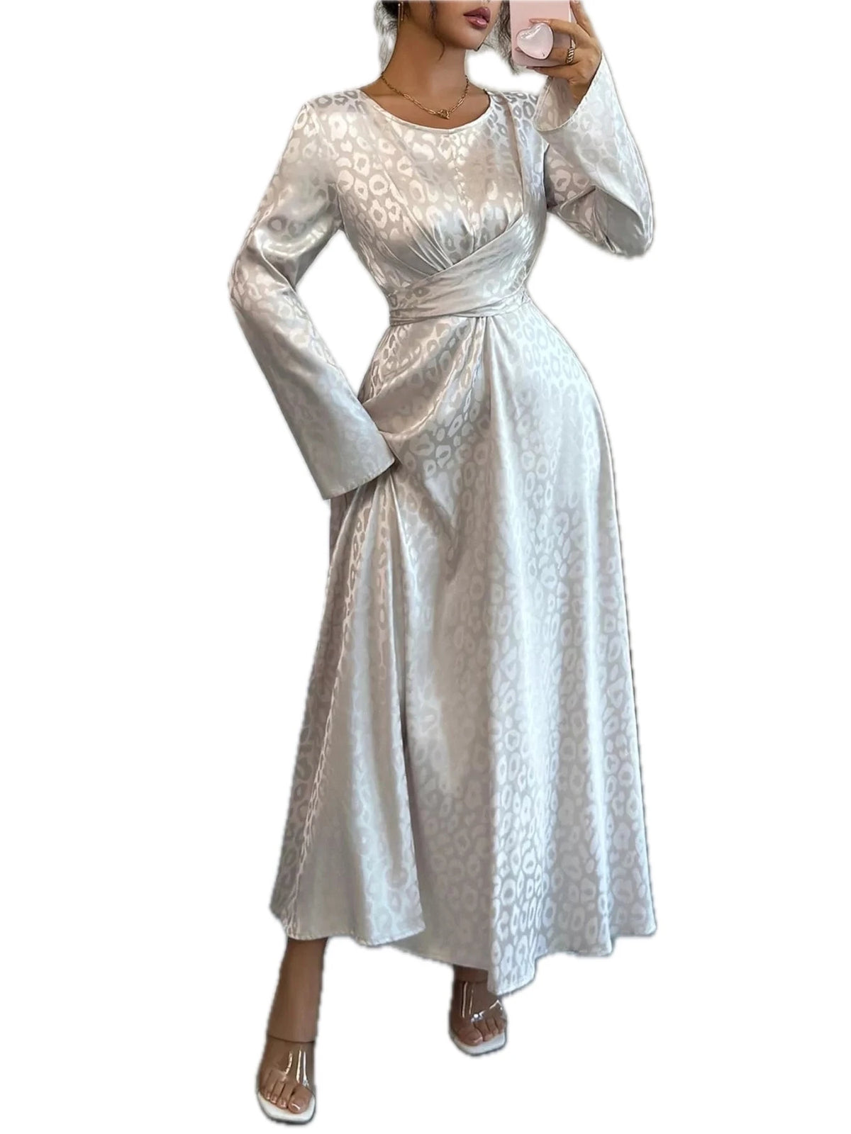 Women's Leopard Long Sleeve Maxi Dress with Tie Back and Zipper Details 100% Polyester Fabric Flattering Silhouette