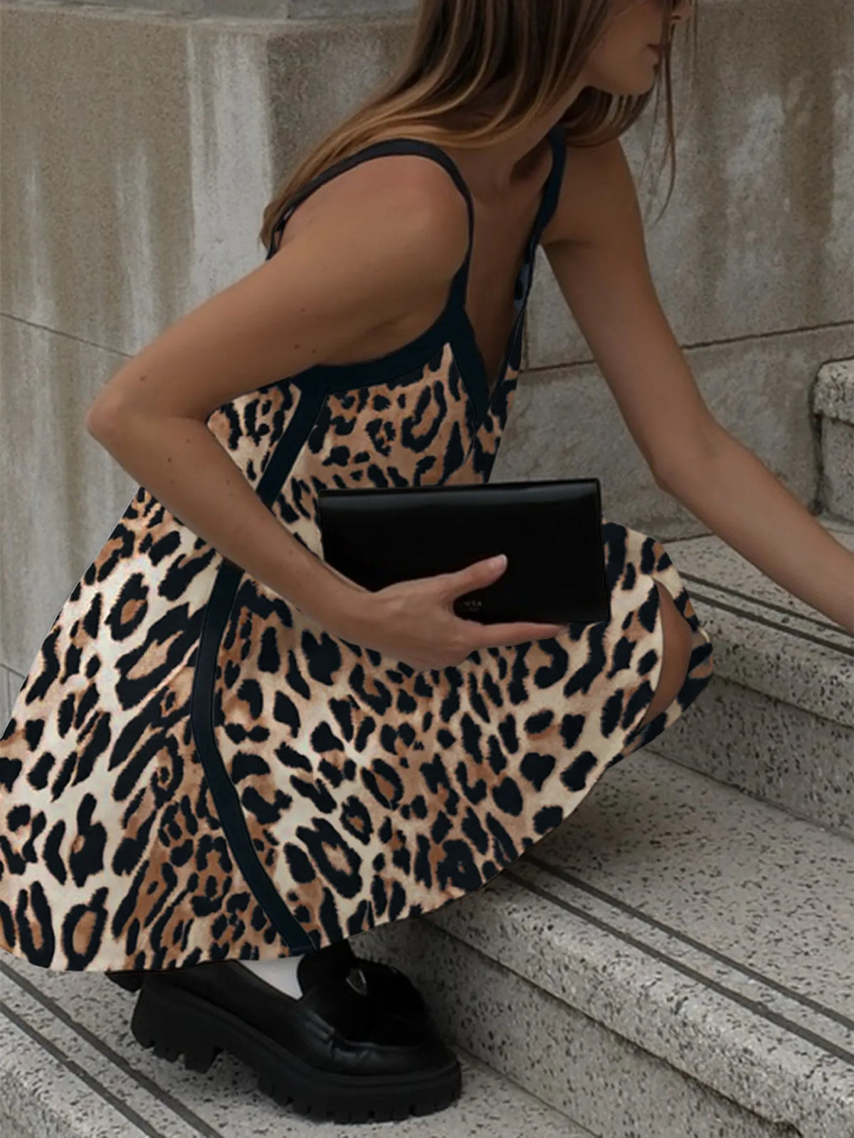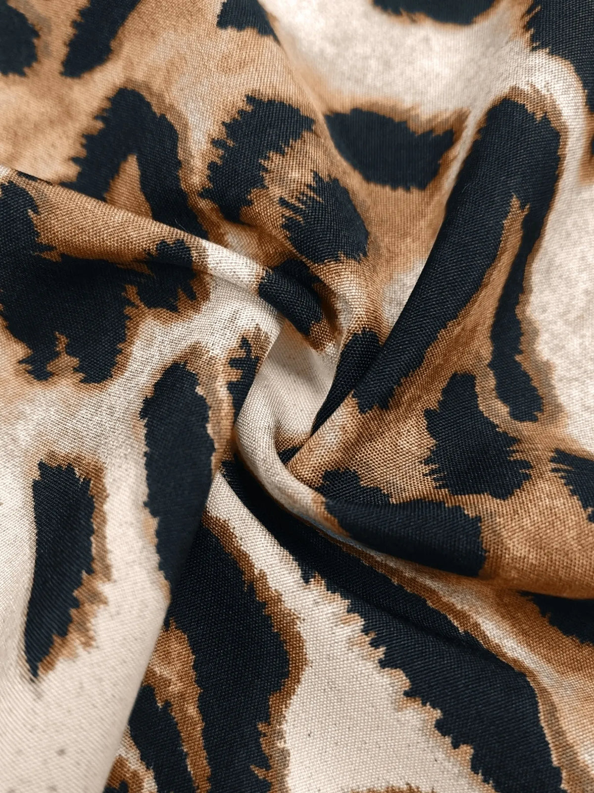This eye-catching Leopard Print V-neck Cami Swing Dress features a classic animal print pattern in neutral tones of brown and black. Made from lightweight, breathable fabric, this dress offers both style and comfort. The V-neckline with black trim adds a flattering touch, while the swing silhouette creates an effortless, feminine look. The adjustable spaghetti straps ensure a perfect fit. Perfect for casual outings, summer events, or beach vacations. The dress can be easily dressed up or down with accessories and pairs well with both flats and heels.