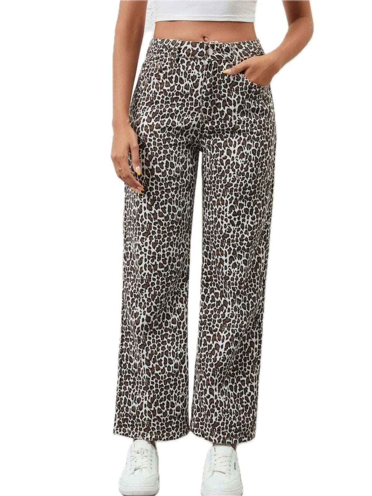 Womens Leopard Print Wide Leg High Waisted Stretch Denim Jeans Casual Trousers For Everyday Versatile Wear Daily