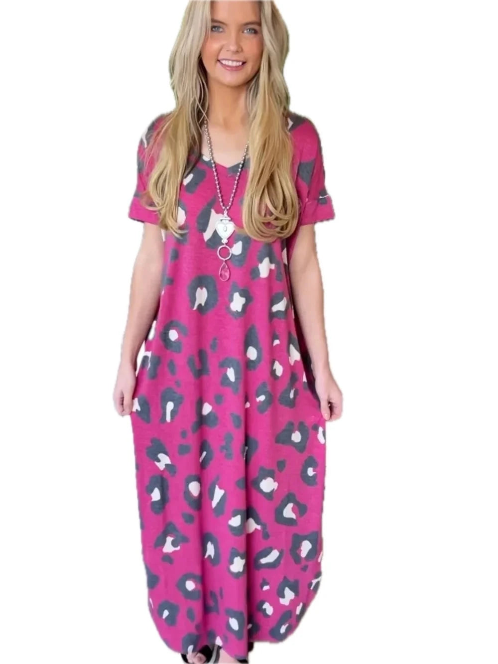 Women's Leopard Slit V Neck Short Sleeve Maxi Dress with Flowing Silhouette for Day to Night Wear Polyester % fabric