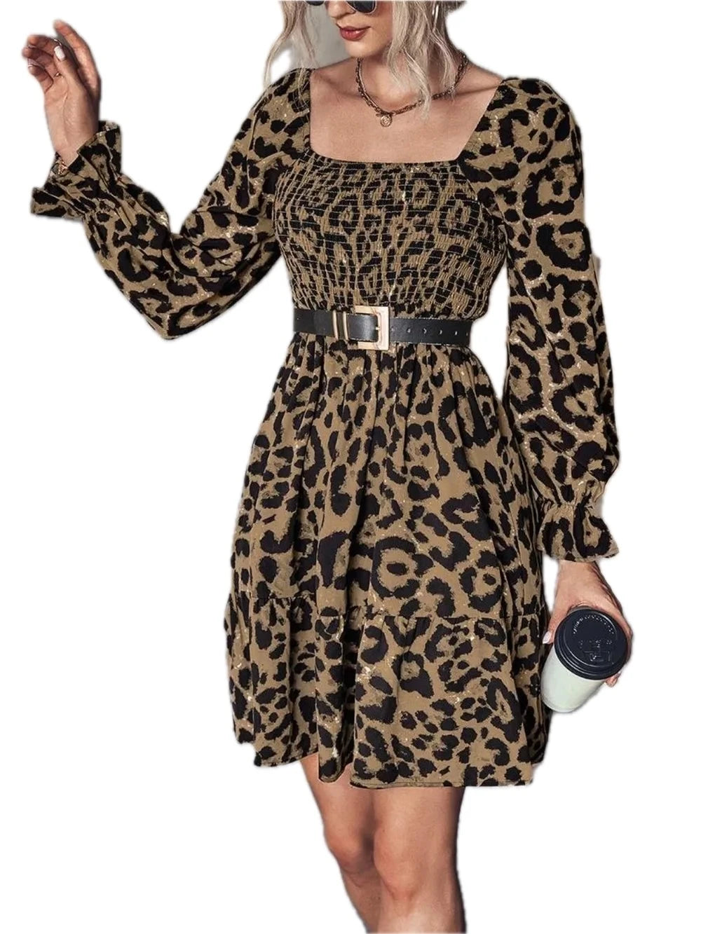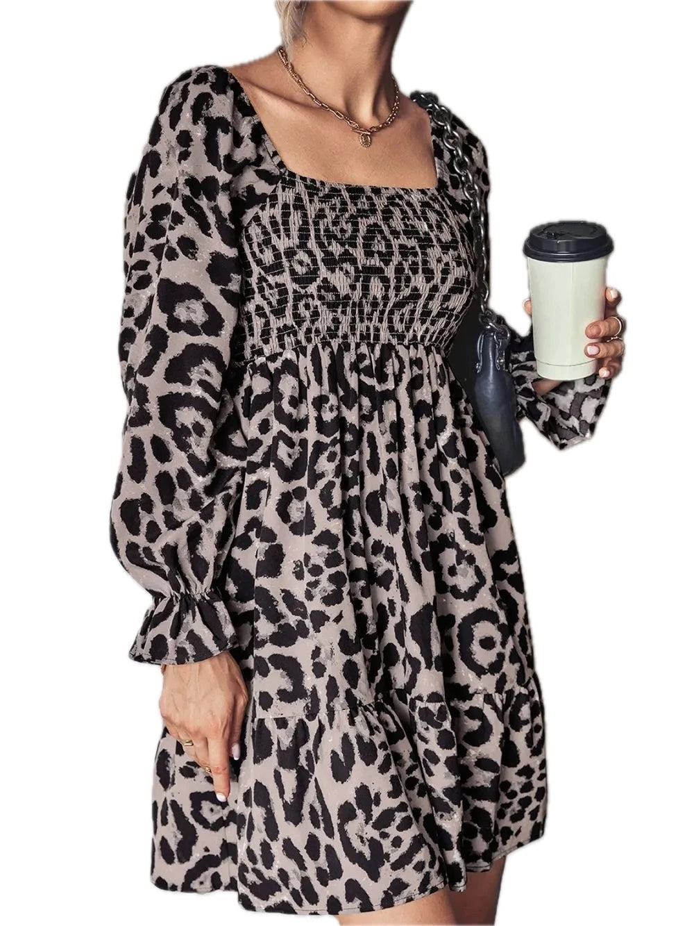 Women's Leopard Smocked Flounce Sleeve Mini Dress for Summer Parties Lightweight Polyester % Spandex % for events