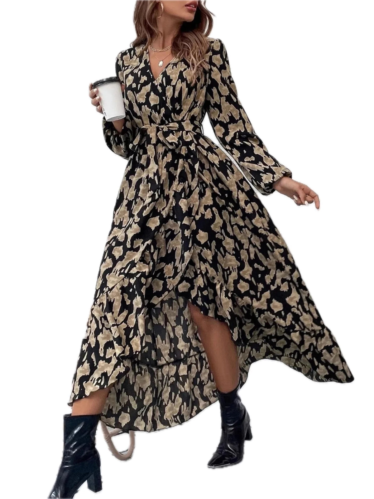 Women's Leopard Surplice Balloon Sleeve Dress with 100% Polyester Fabric for a Flattering Fit and Elegant Look