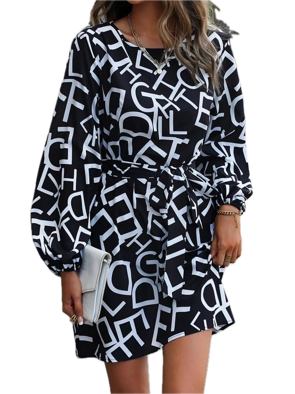Women's Letter Print Balloon Sleeve Dress with Ninety Five Percent Polyester and Five Percent Spandex for Everyday Wear