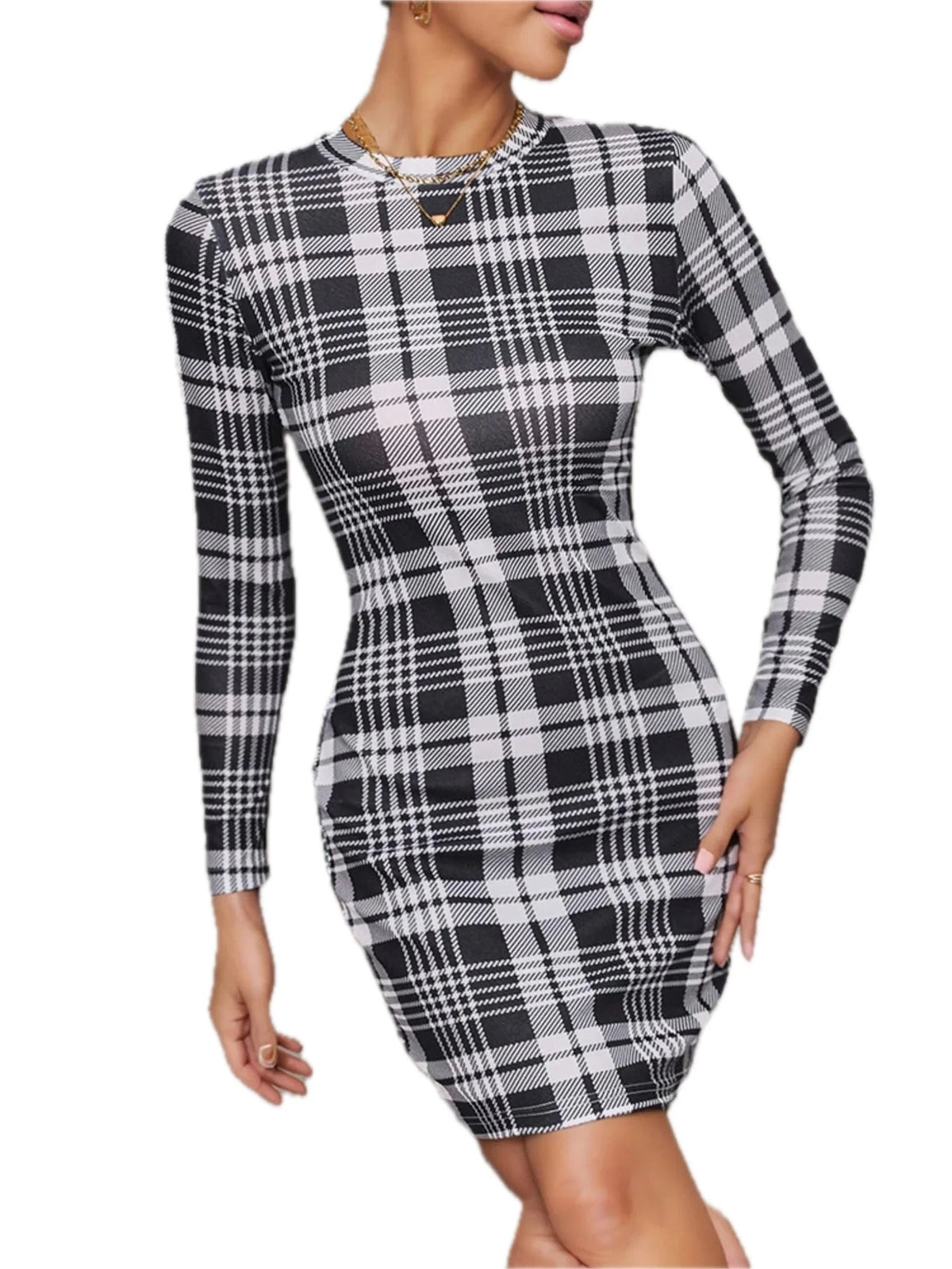 Women's Long Sleeve Plaid Bodycon Mini Dress Made of Polyester Fabric with Sleek Tailored Fit for Everyday Modern Style