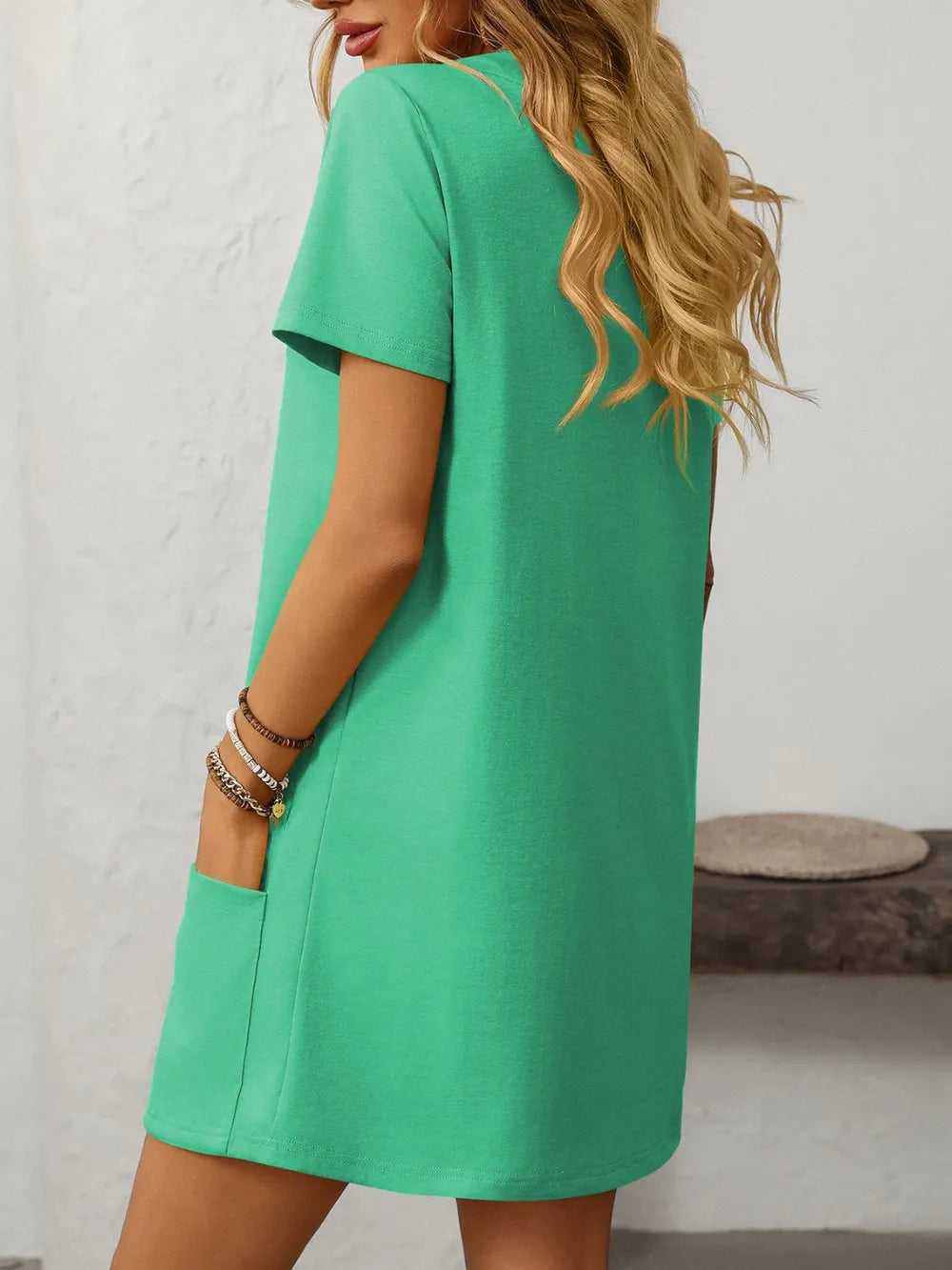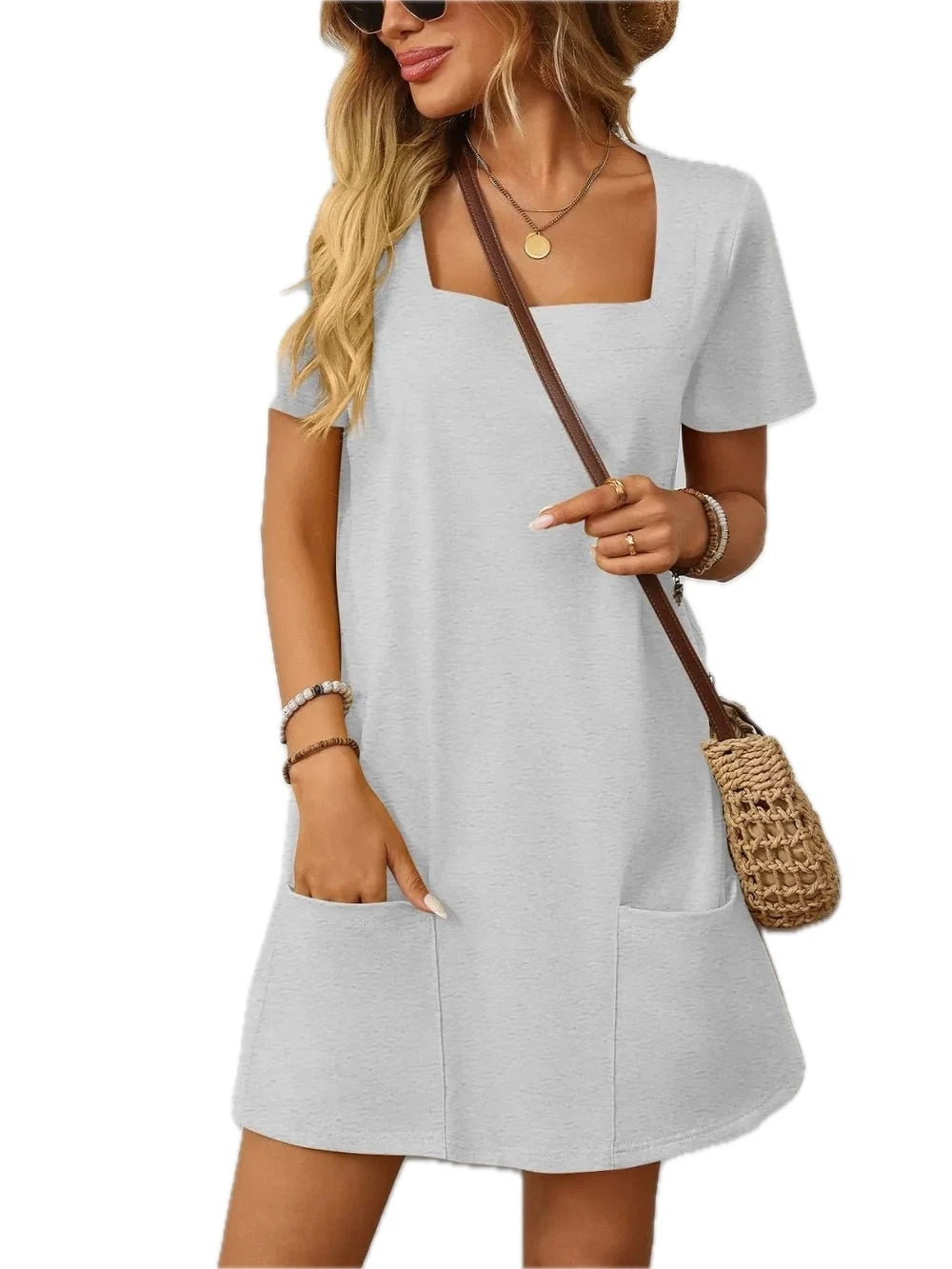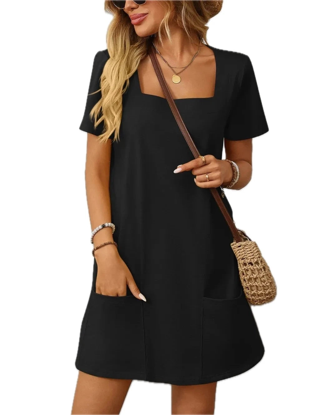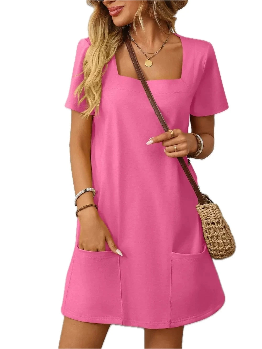 Women's Square Neck Short Sleeve Mini Dress with Pockets Sheer Overlay and Stretch 65% Polyester 30% Viscose 5% Elastane