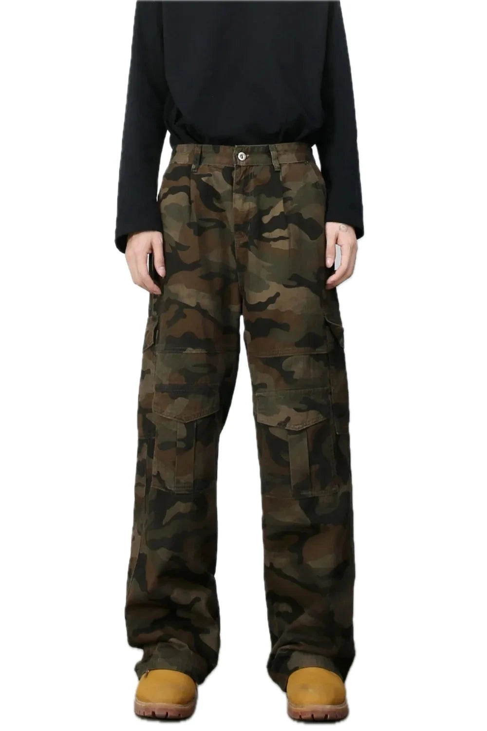 Mens Camouflage Loose Fit Pocketed Jeans for Casual Outdoor Wear Durable Cotton Denim Trousers with Belt Loops All