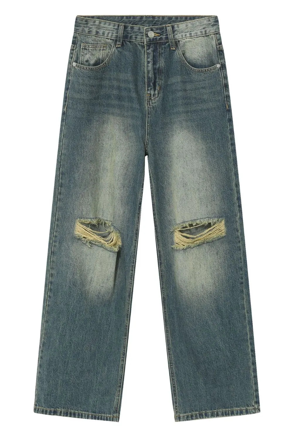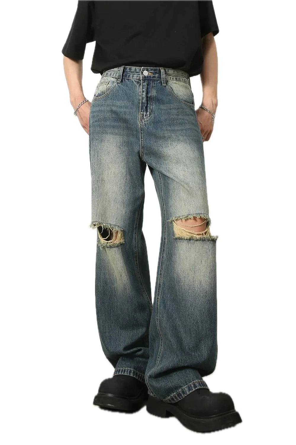 Mens Distressed Baggy Jeans Raw Hem Casual Fit Durable Denim Pants for Everyday Wear Trendy Streetwear Style Casual