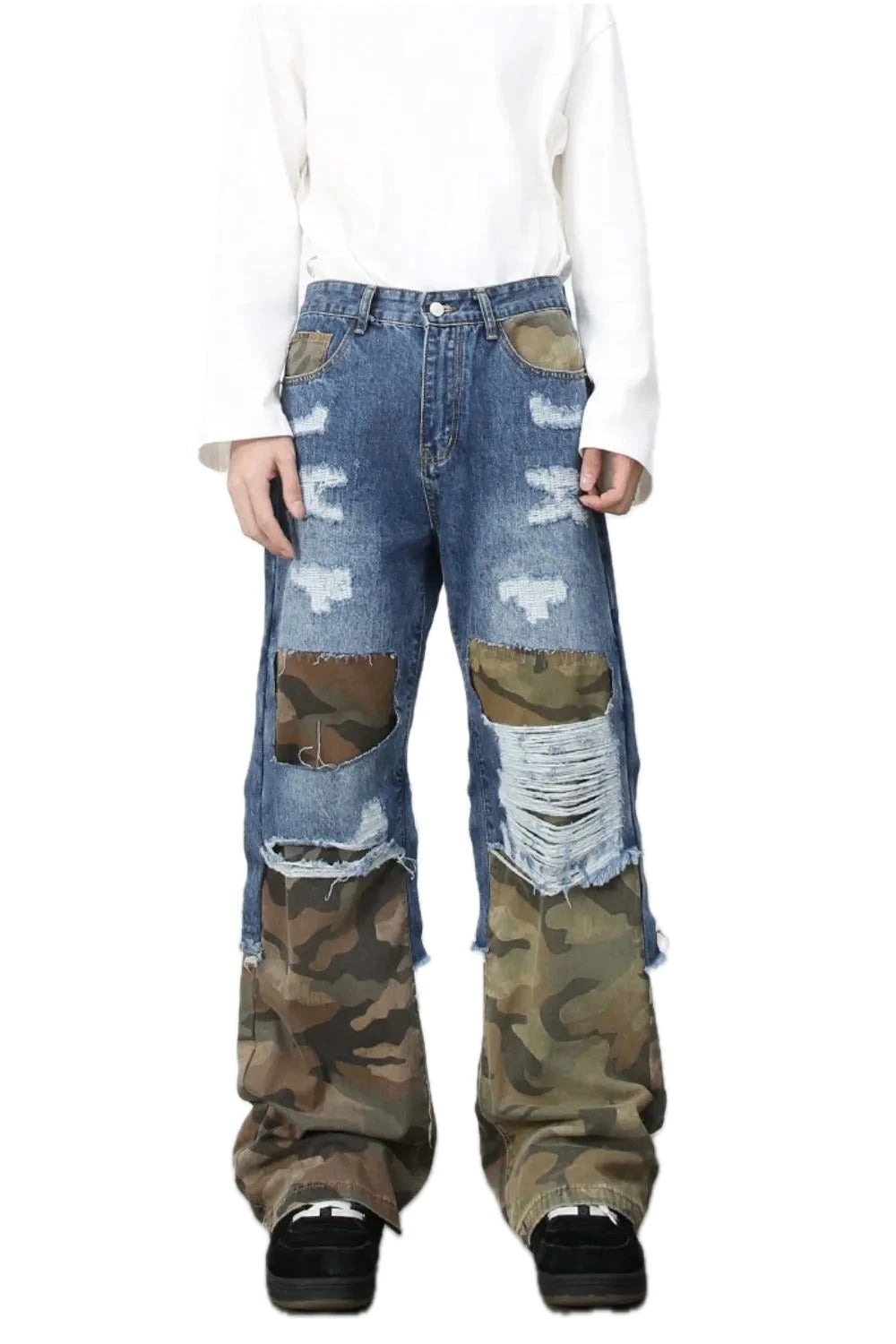 Mens Distressed Camouflage Jeans with Raw Hem Design Durable Denim Pants for Casual Everyday Wear for all seasons
