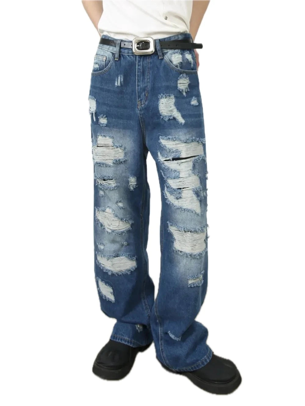 Mens Distressed Jeans With Pockets And Raw Hem Design Durable Denim Pants For Casual Everyday Wear And Versatile Style