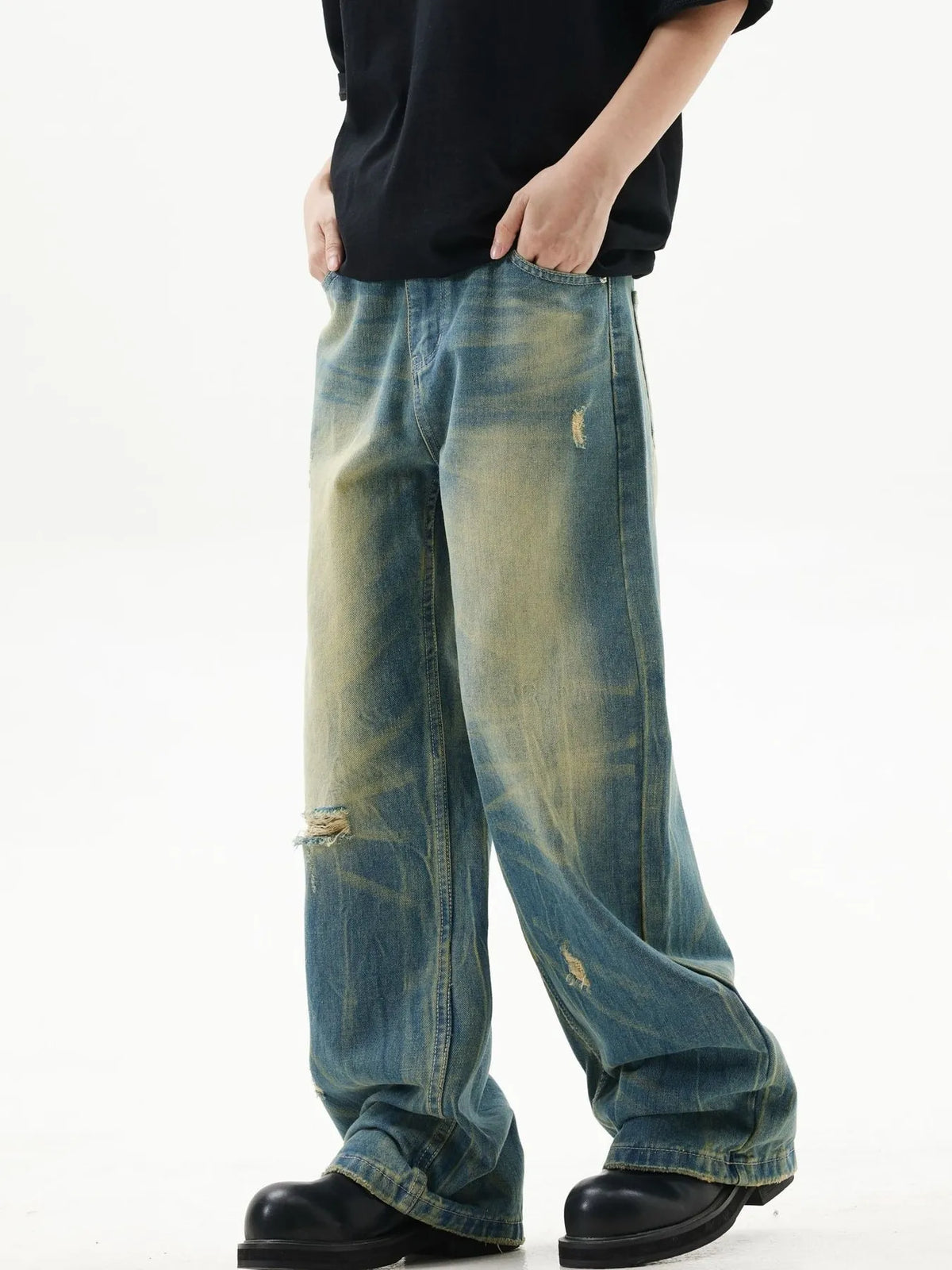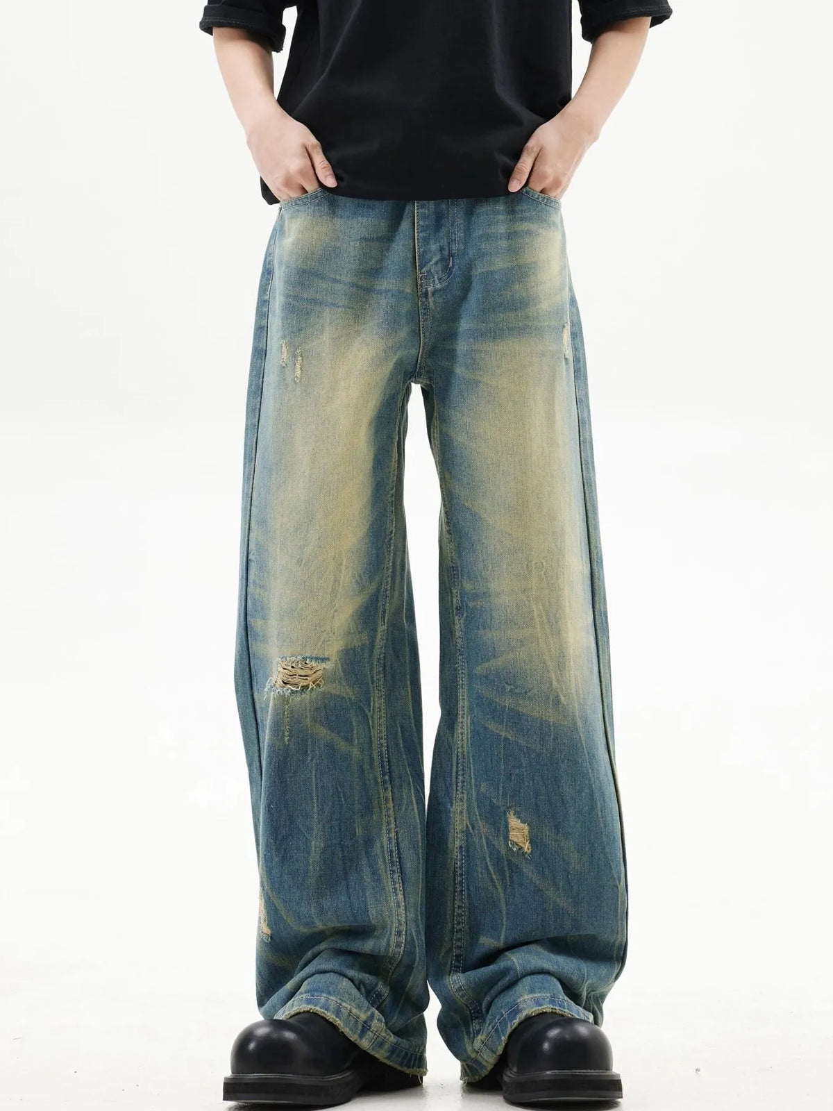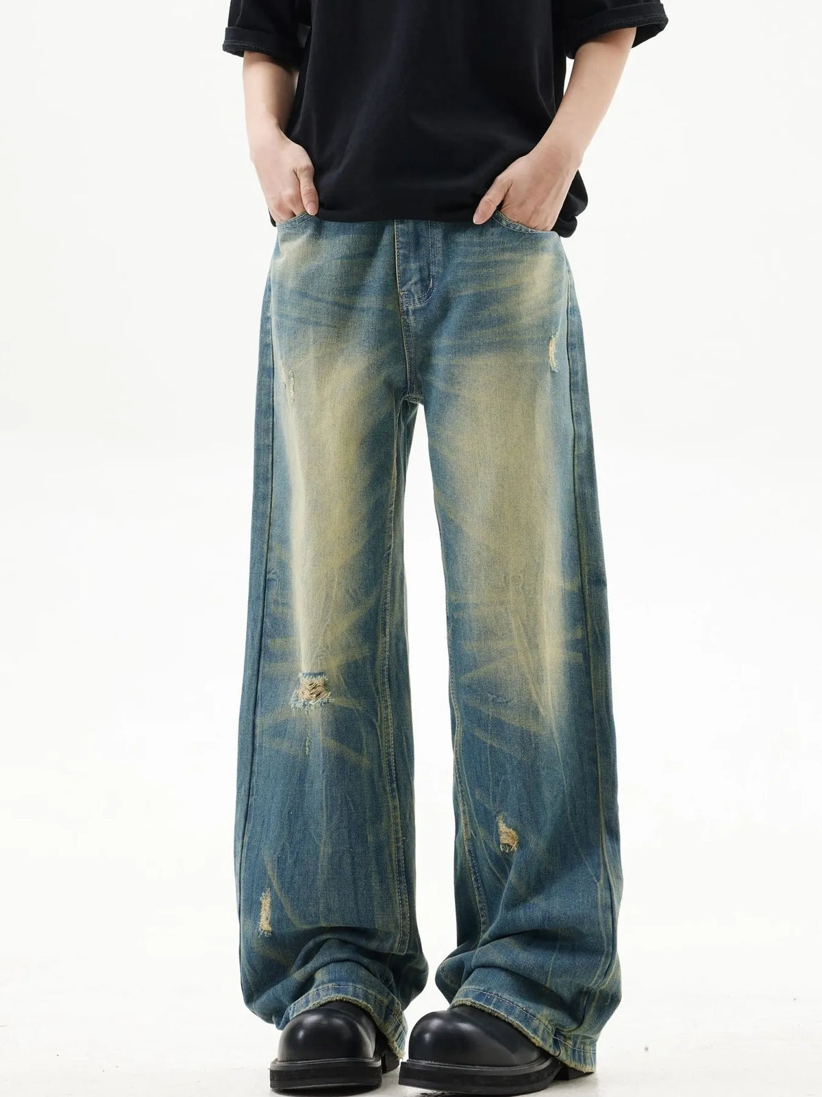 Mens Distressed Wide Leg Jeans Washed Casual Streetwear Durable Versatile Everyday Wear Wardrobe Essential Daily
