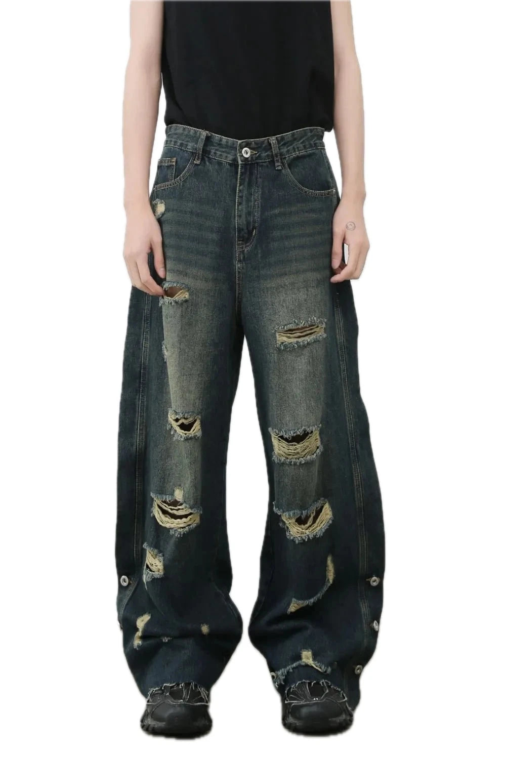 Mens Frayed Hem Distressed Wide Leg Jeans with Raw Hem Casual Fit Everyday Streetwear Denim Pants Durable Fit