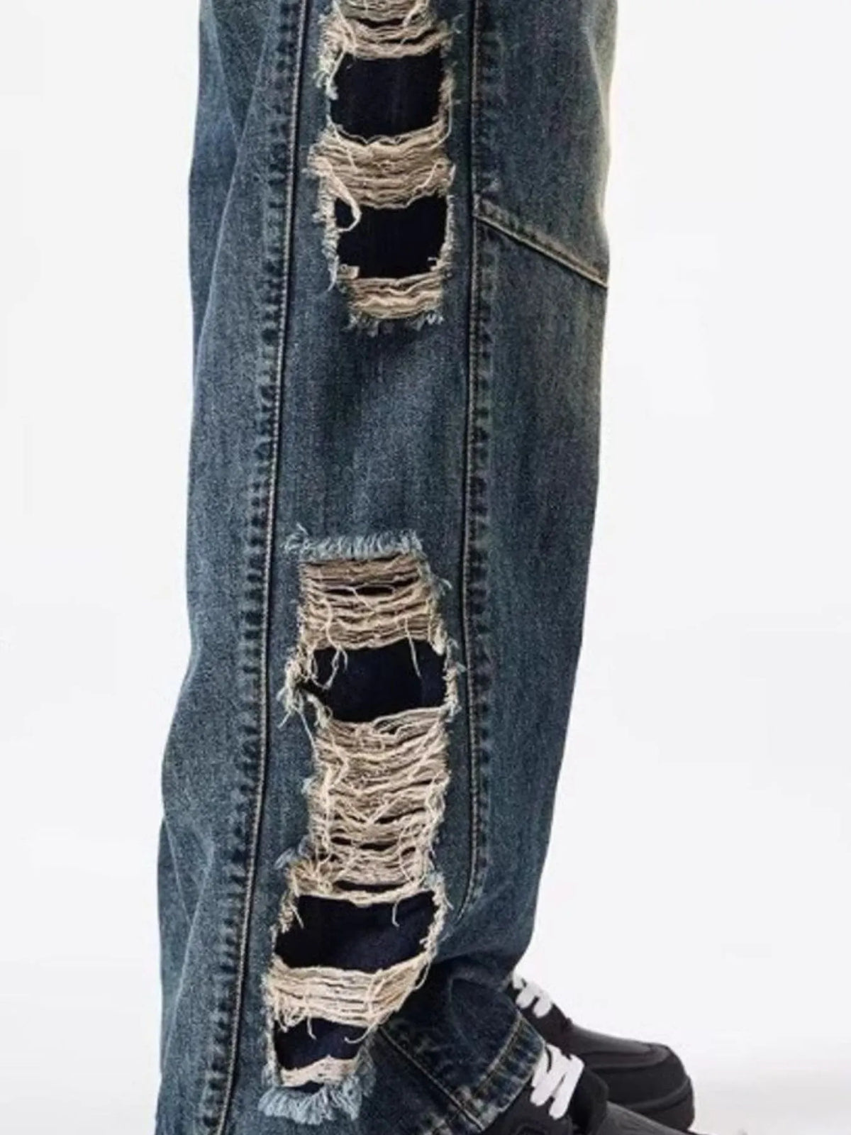 Mens Distressed Wide Leg Baggy Jeans Plus Size Pocketed Washed Durable Relaxed Fit Denim Pants Streetwear Casual