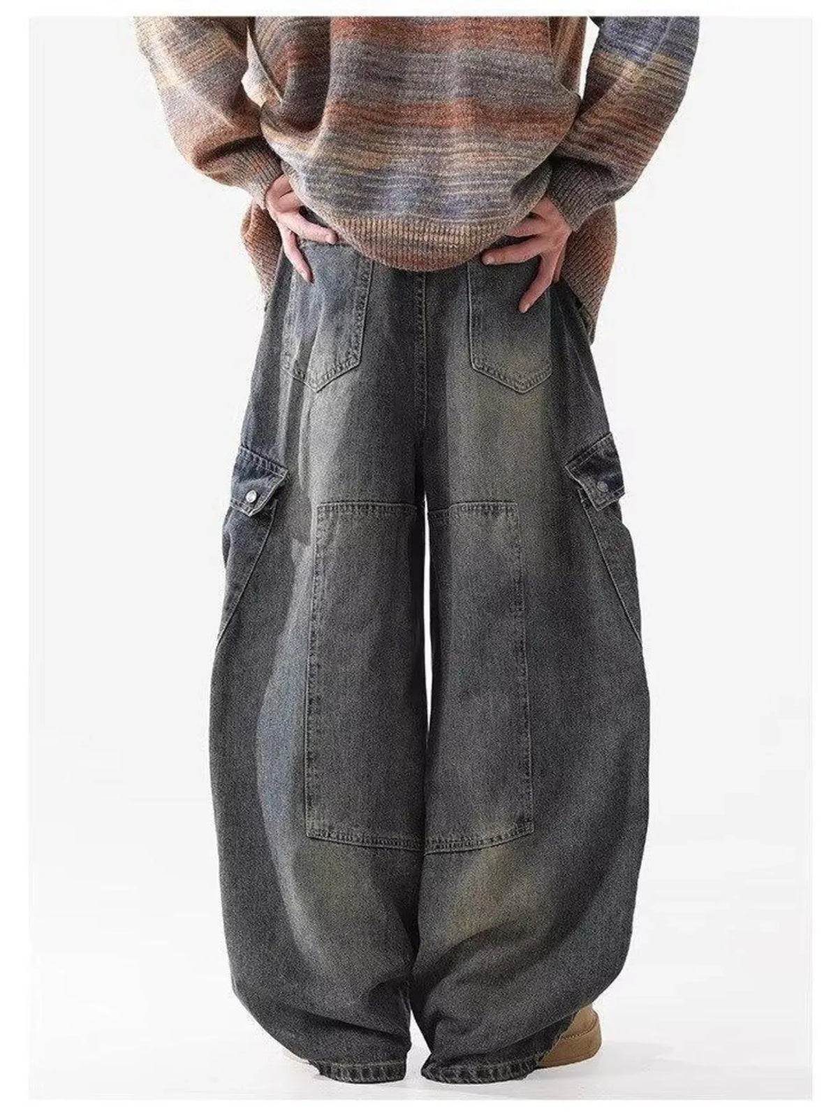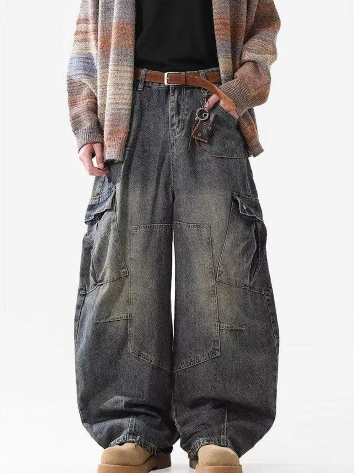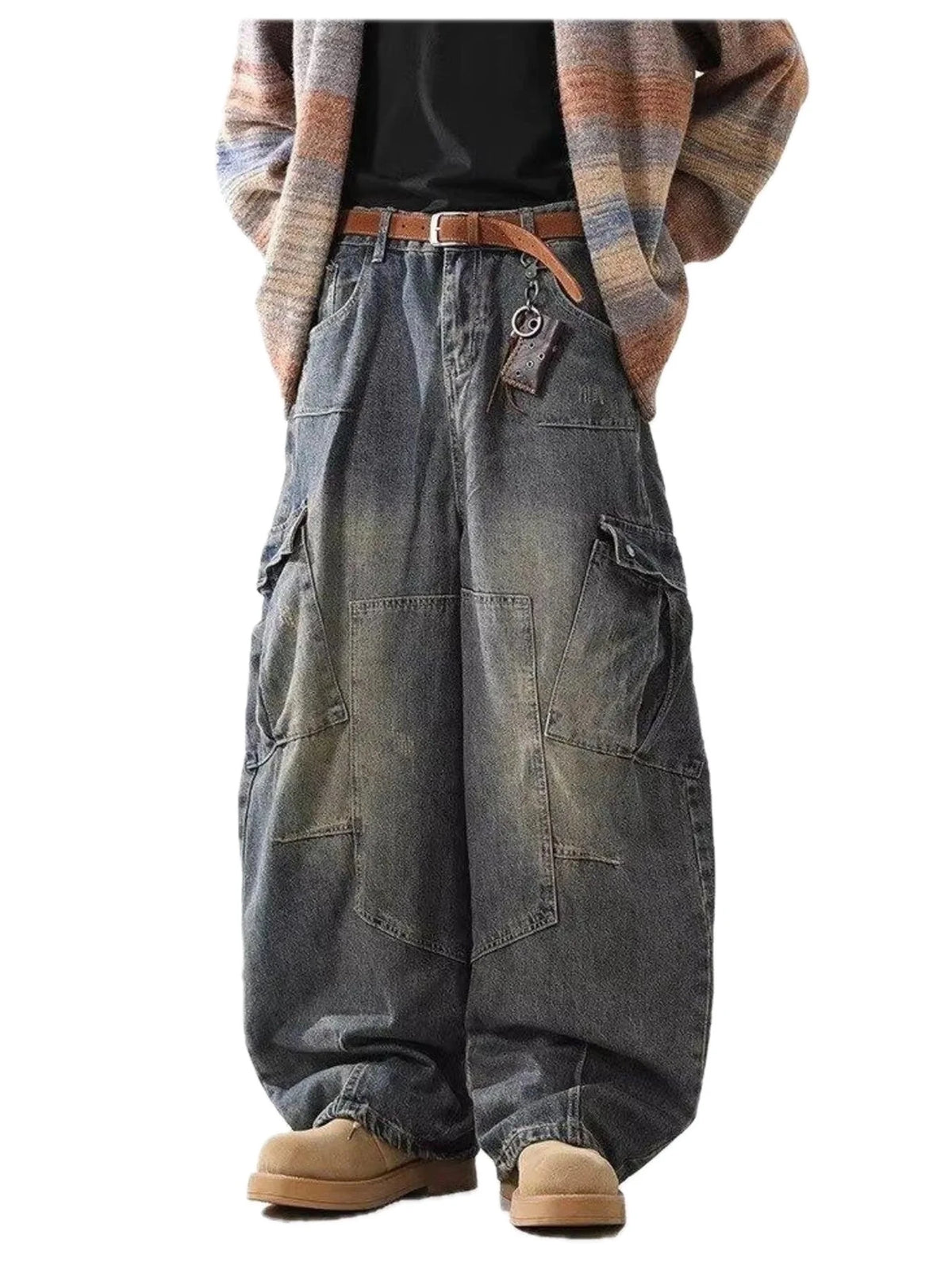 Mens Wide Leg Cargo Jeans Oversized Plus Size Pocketed Washed Durable Relaxed Fit Casual Pants With Multiple Pockets